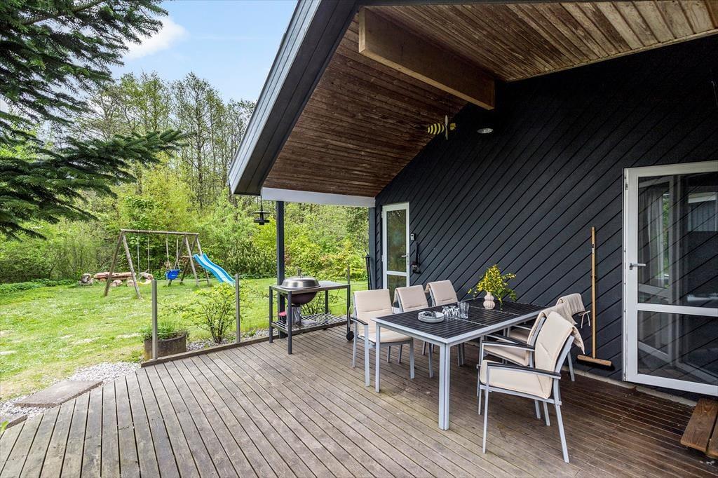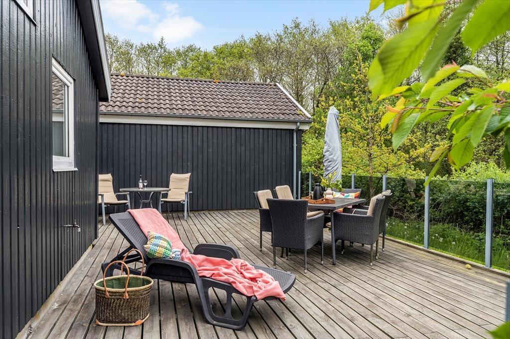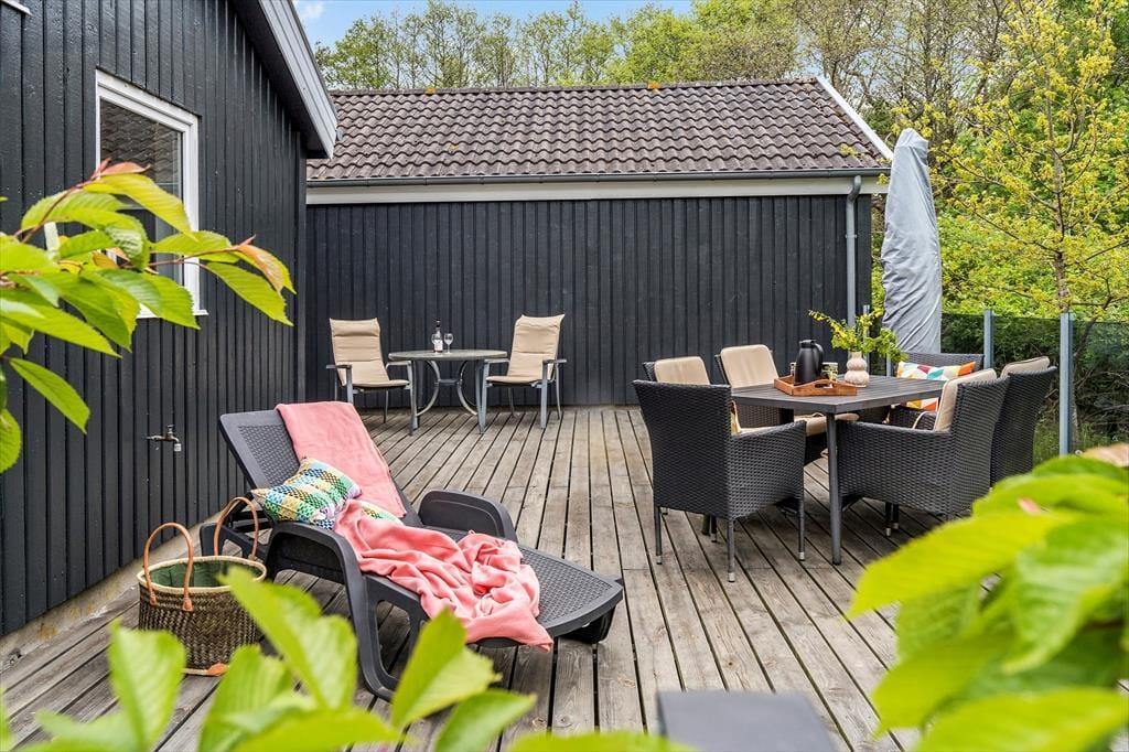 Der er mange terrasse områder rundt om huset, som gør at du altid kan finde lige den solplet du ønsker, når solen er fremme naturligvis. Haven indbyder også til aktiviteter, så her kan alle deltage i udespil, lige meget om du er stor eller lille. Hyggen kan også kommer når du sidder ved det store havebord og der er mad på grillen, så det er bare med at komme afsted, her er rammerne for en dejlig ferie for alle. Barnestol og barneseng er der også i huset, så det behøver du ikke tage med.