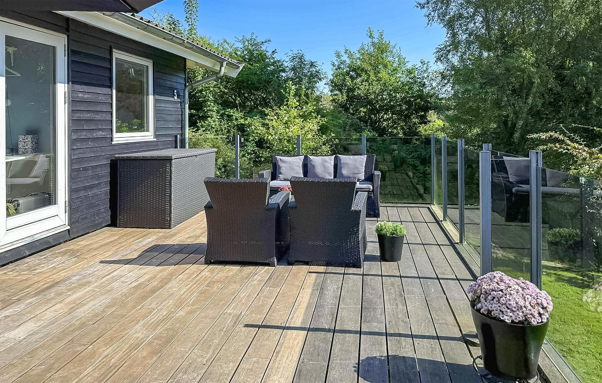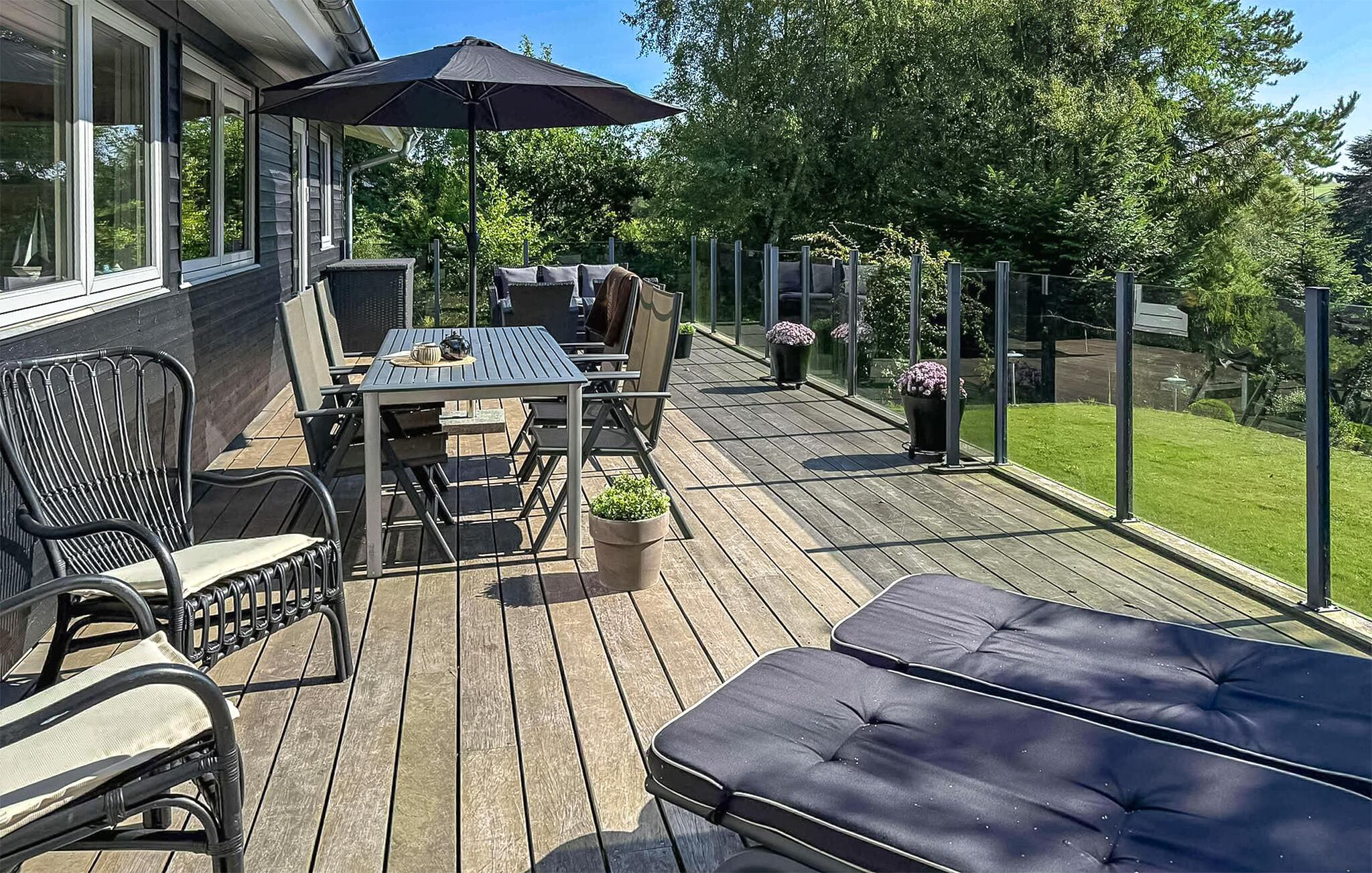 Hyggeligt sommerhus med smuk udsigt, stor terrasse, udespa og tæt på populær sandstrand i Ebeltoft området.
