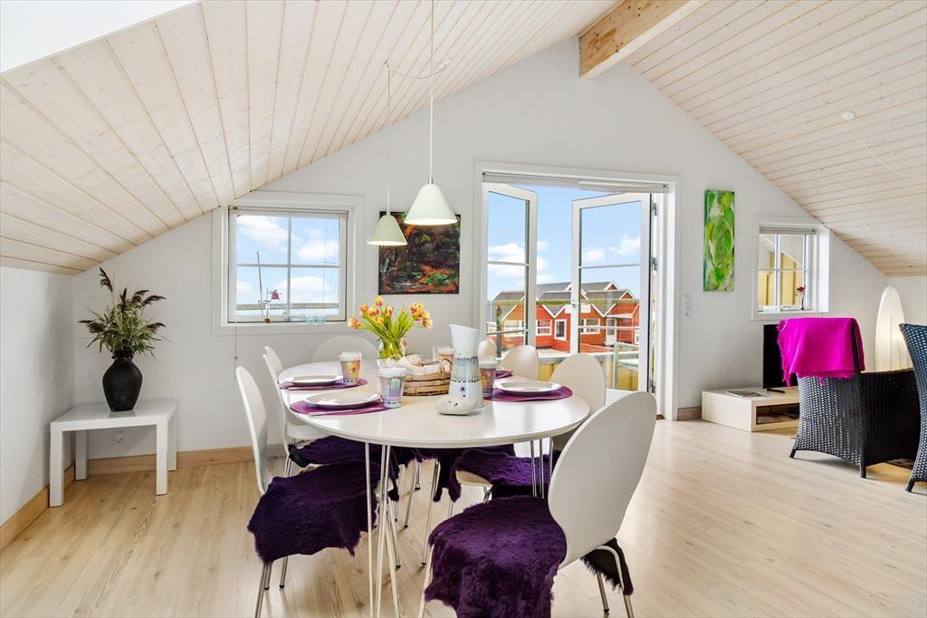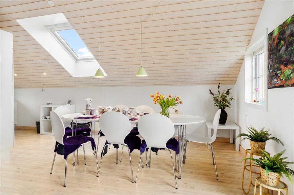 Dette rum er lyst og åbent, og samtidig er det meget hyggelige rammer at samle hele familien eller vennerne i. Den gode udsigt kan nydes gennem de store sydvendte vinduer fra både spisebordet og den hyggelige sofastue. I de komfortable sofamøbler kan I samles om et spil eller tænde for TV´et og slappe helt af. Fra stuen er der terrassedøre ud til den overdækkede altan. På den måde bliver altanen en forlængelse af stuen og det er helt perfekt tage hyggen med udenfor, hvor I kan sætte jer og nyde udsigten over hele Mårup havn og Sælvig bugten.
