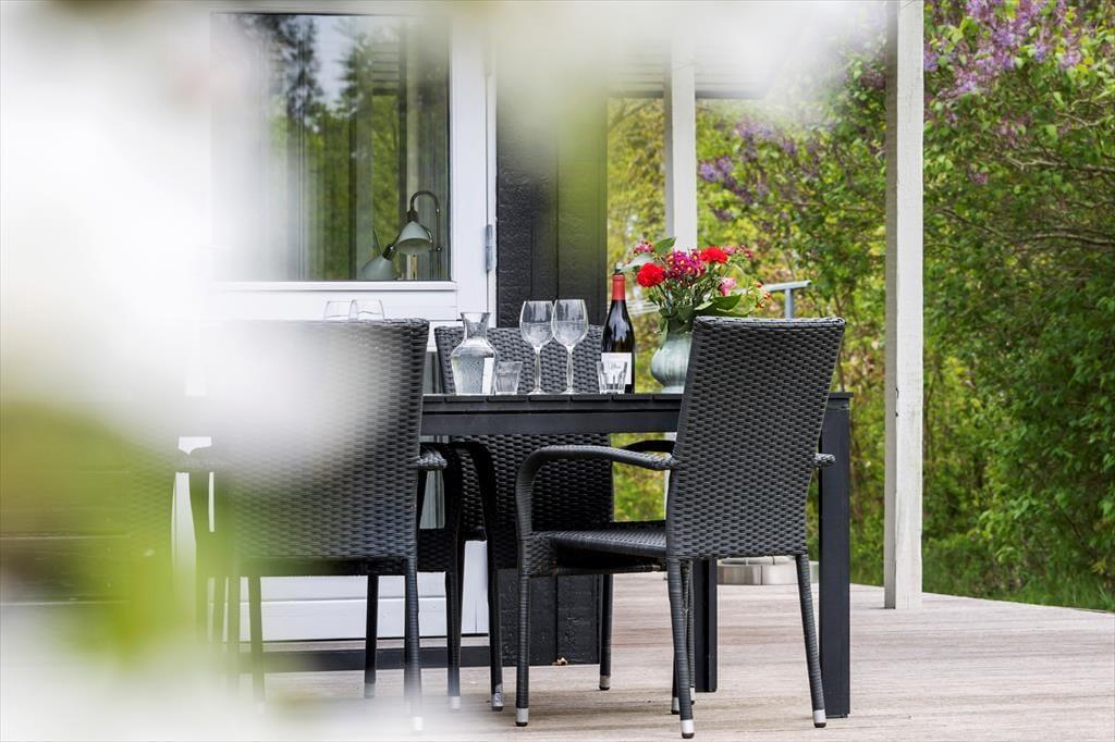 Omkring huset er en træterrasse, hvor der er udgang til både fra køkkenet, stuen og et soveværelse.