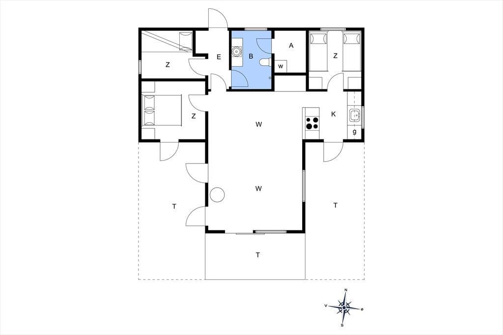 Sommerhuset har tre soveværelser, der passer perfekt til 4 voksne og 2 børn. Det ene soveværelse har en god dobbeltseng samt en havedør der fører ud på terrassen. Det andet soveværelse har to enkeltmandssenge, og det tredje værelse har en køjeseng. I alle værelser er der gode vinduer ud mod haven og skabsplads. Husets badeværelse er som resten af huset lyst og har en god størrelse, så alle faciliteter er på plads til, når I skal på ferie i dette sommerhus helt tæt på naturen og stranden.