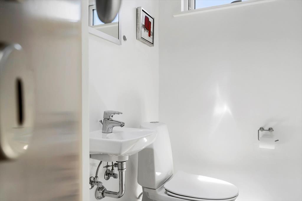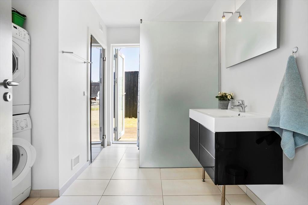 I huset er to badeværelser, hvoraf det største badeværelse et lyst og indbydende med direkte udgang til terrassen mod havet. I dette badeværelse er også en sauna og vaskemaskine samt tørretumbler, så der er tænkt på alle fornødenheder, når ferien skal nydes til fulde. Det mindre badeværelse giver en ekstra komfort, når I er op til 8 gæster i huset.