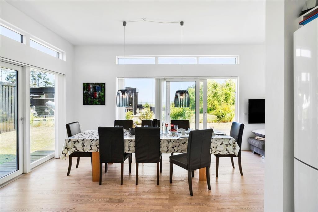 Husets store samlingsrum er køkken-alrummet, hvor det åbne køkken er i forbindelse med spisebordspladsen og sofahjørnet. Ved spisebordet og sofaen er der store vinduer, hvorfra man til fulde kan nyde udsigten til stranden og havet. Omkring spisebordet er der plads til alle gæster, og herfra er det også let at tale med dem, der står i køkkenet eller har sat sig til rette i sofaen.