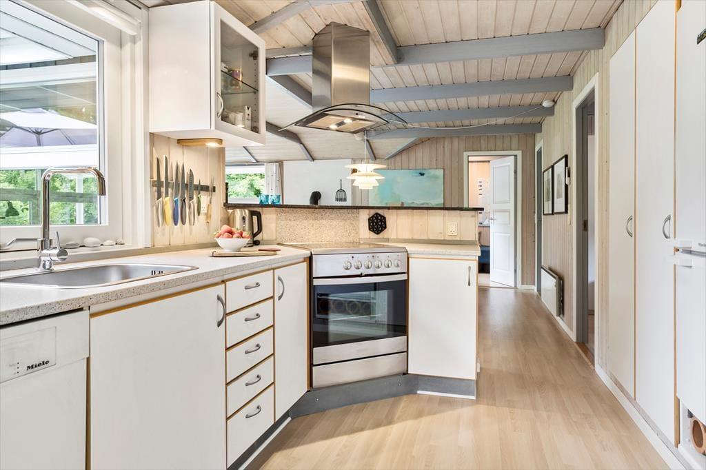 Gennemgående i sommerhuset er de lyse trævægge og lofter, der skaber en hyggelig og indbydende stemning, som du mærker med det samme. Samtidig er en blandt andet den lille entre med til at gøre huset praktisk, og der er tænkt på alle detaljer, så du er sikret en god sommerhusferie her.