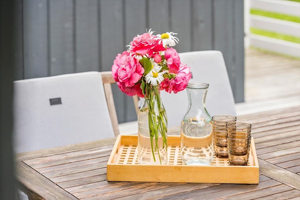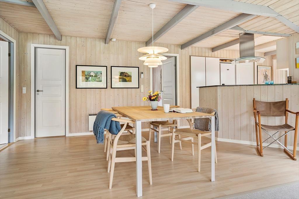 Spisebordet er centralt placeret i rummet, og her kan I samles om måltiderne eller planlægge dagens oplevelser. Huset har et åbent og fuldt udstyret køkken, så I kan let tilberede feriens måltider her. Samtidig kan du stadig være med i samtalerne om spisebordet, hvis du står over gryderne.