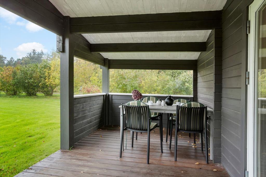 Fra stuen træder I direkte ud på en dejlig, overdækket vestvendt terrasse, som giver ekstra plads til samvær, når vejret er godt. Her kan I nyde måltiderne og den skønne udsigt over marker og bakker – med mulighed for en smuk solnedgang.
