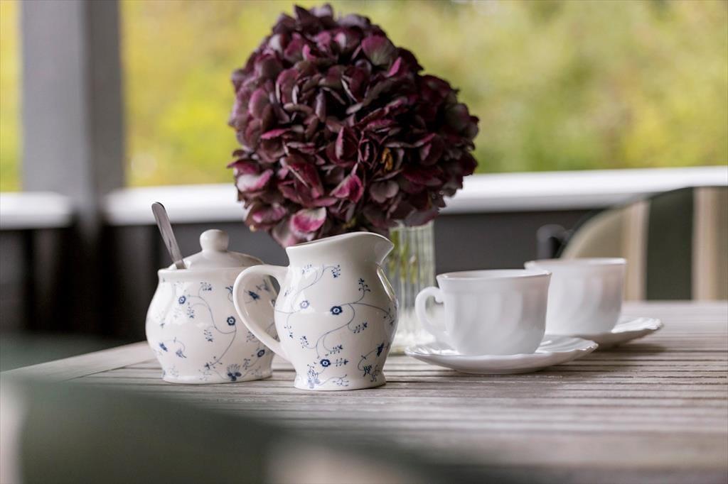 Den sydvendte træterrasse er ideel til morgenkaffen og til solbadning i liggestolene.