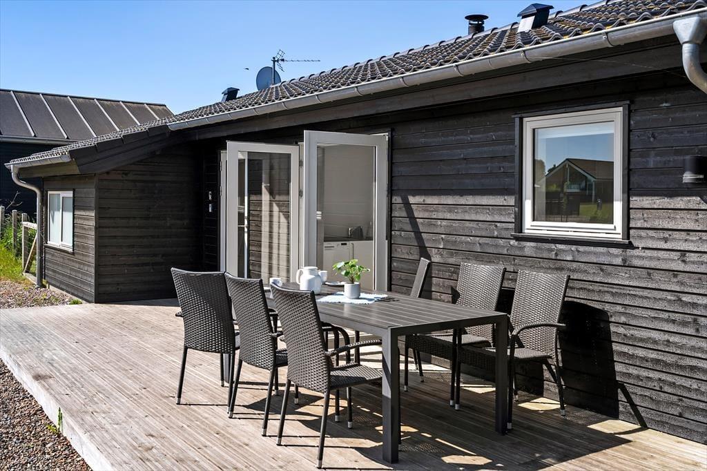 De store træterrasser rundt om huset giver jer mulighed for at følge solen fra morgen til aften. Her kan I spise udendørs, læne jer tilbage i liggestole eller bare nyde naturen. Ved indgangen finder I endnu en terrasse, som er ideel til morgenkaffen og stille morgener.