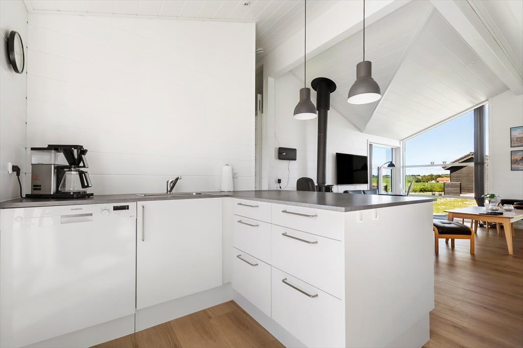 I stuen kan du slappe af med en god bog eller tænde for tv’et efter en dag fyldt med oplevelser på øen. Det åbne køkken er fuldt udstyret og klar til at imødekomme dine kulinariske eventyr. Designet skaber en behagelig forbindelse mellem madlavning og samvær, så du nemt kan være en del af samtalen med familie eller venner, mens maden tilberedes.