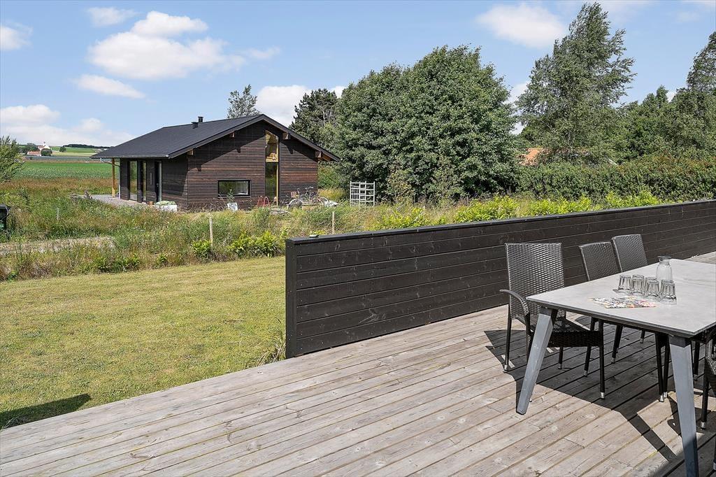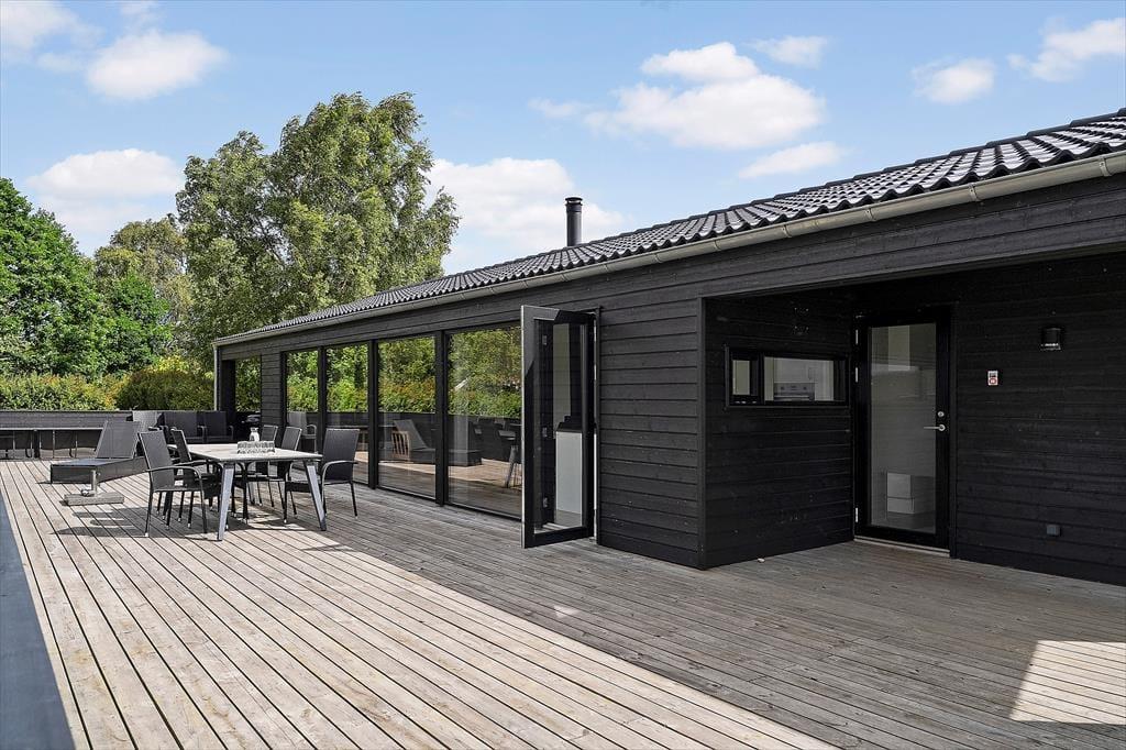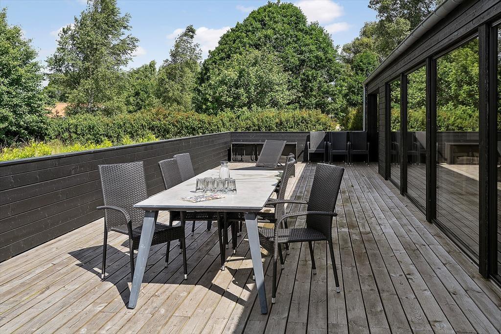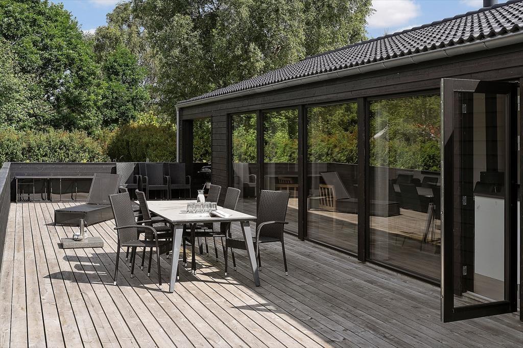 De store træterrasser ved huset giver jer mulighed for at følge solen fra morgen til aften. Her kan I spise udendørs, læne jer tilbage i liggestole eller bare nyde naturen. Terrassen mod øst er ideel til morgenkaffen og stille morgener.