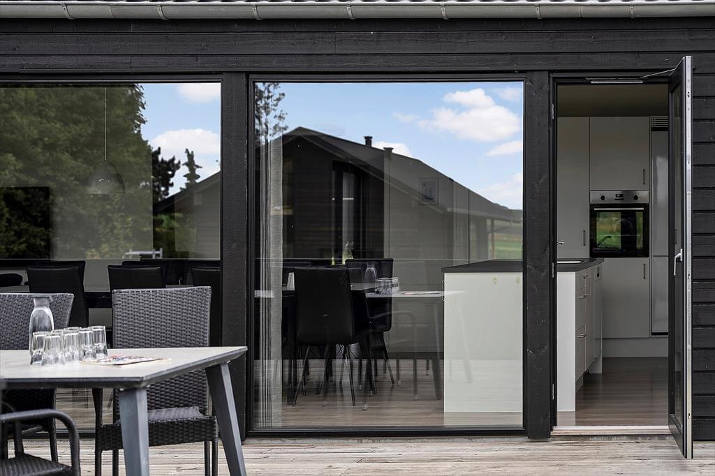 Køkkenet er åbent og har vinduer med udsigt til haven og den vestvendte terrasse, hvilket giver et dejligt lysindfald og udsigt over det åbne landskab. Rundt om spisebordet er der god plads til, at I alle kan nyde måltiderne sammen. Når vejret tillader det, kan I via havedøren gå direkte ud på terrassen og spise under åben himmel eller bruge den overdækkede terrasse.