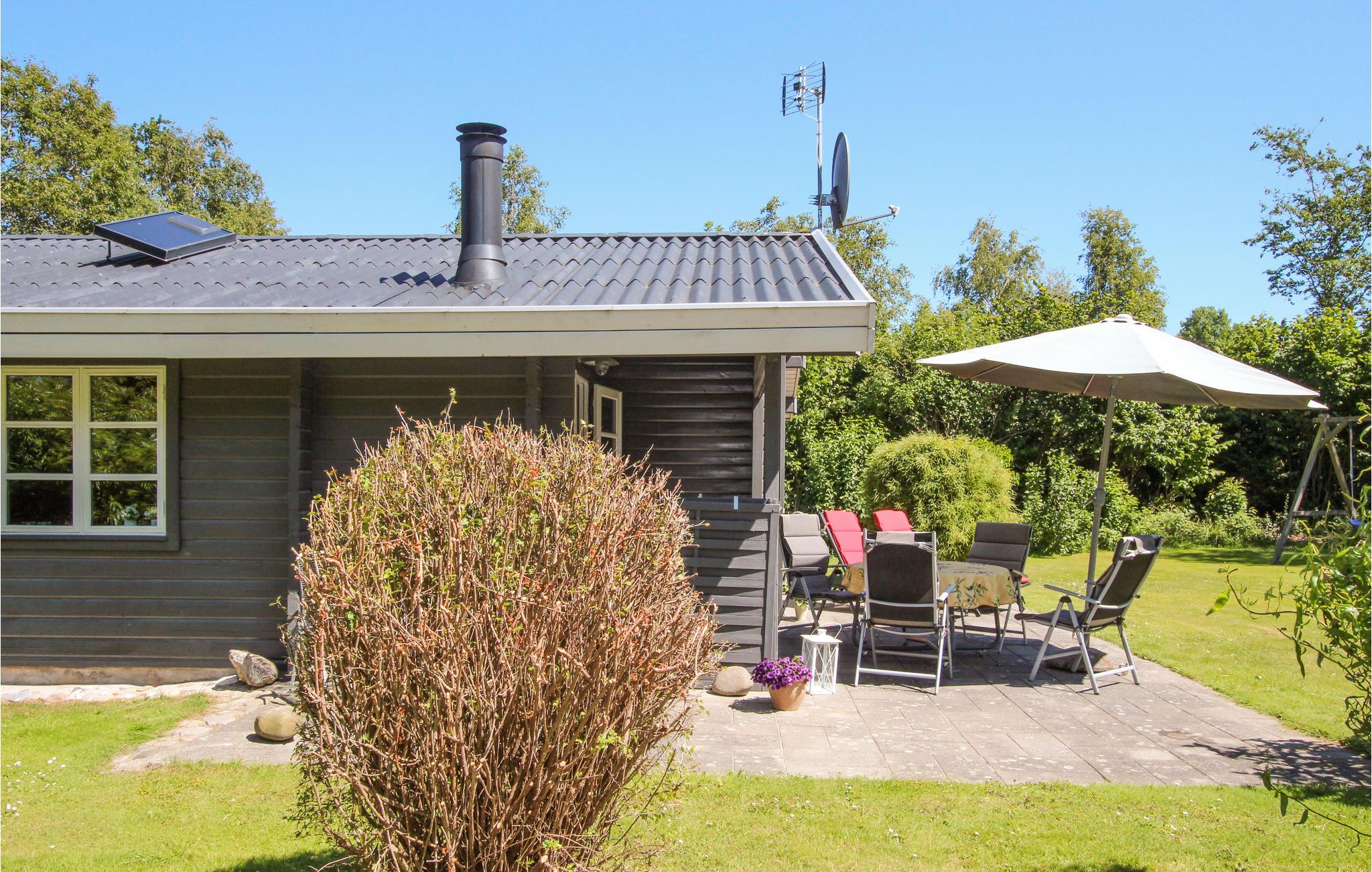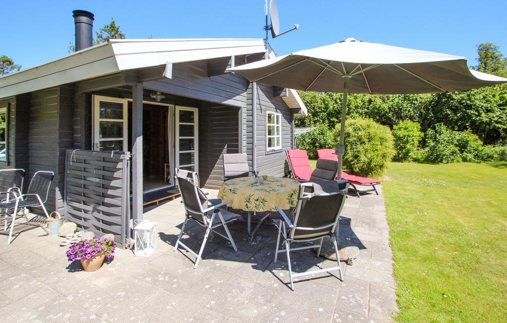 Hyggeligt træhus med terrasse nær stranden på naturskønne Samsø, perfekt til afslapning og oplevelser.