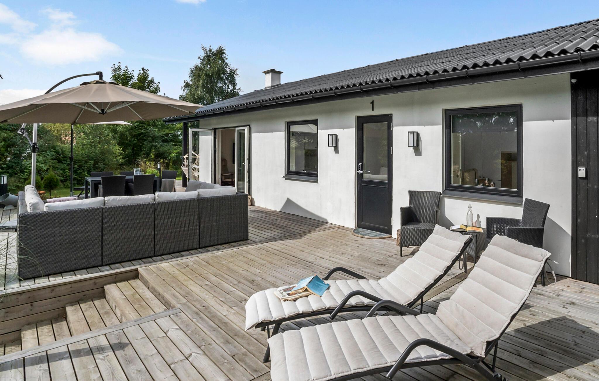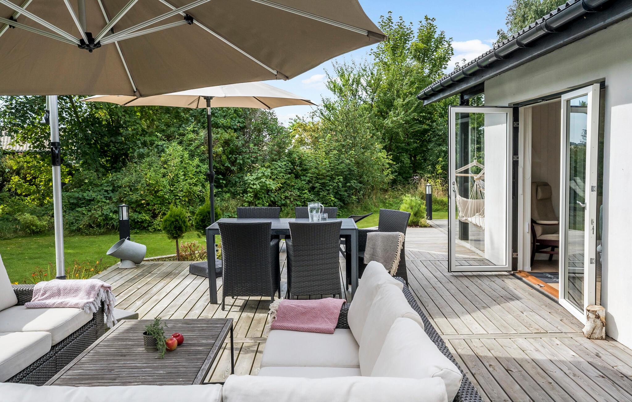Hele familien kan godt begynde at glæde sig til dette familievenlige hus, som emmer af lys, komfort og kvalitetsløsninger. Giv jer god tid til madlavningen i det moderne køkken og dæk op til dagens måltider på terrassen, når solen er fremme. Træterrassen omkranser husets to sider, så I har mulighed for at følge solen hele dagen. Børnene kan boltre sig i den store have, og imens kan I lægge en plan for det næste, I vil ud at se.