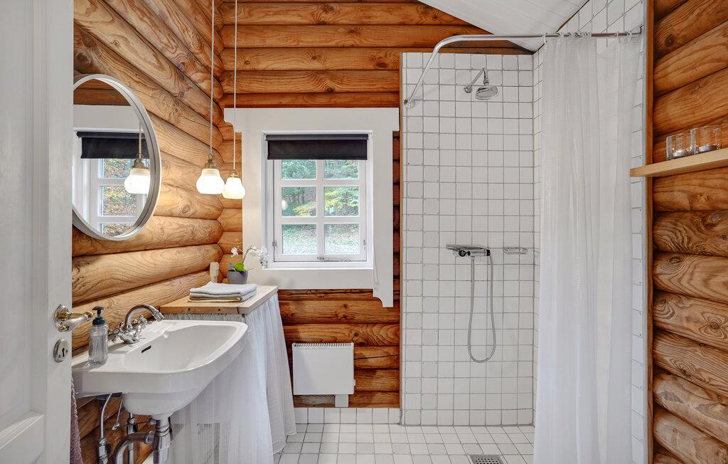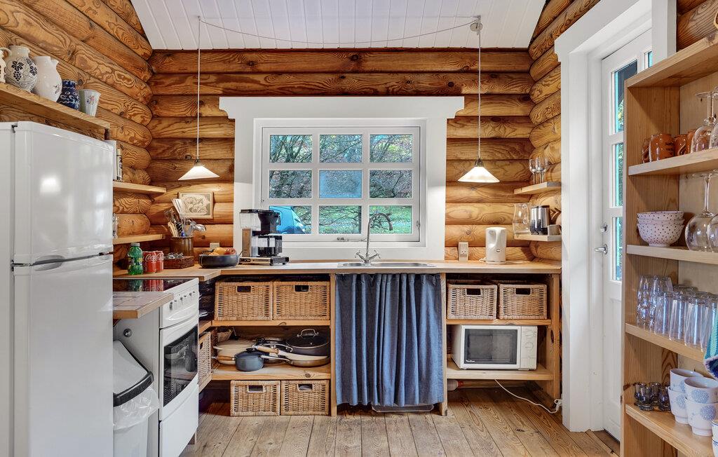 Charmerende bjælkehytte med udsigt over Mariager Fjord.
