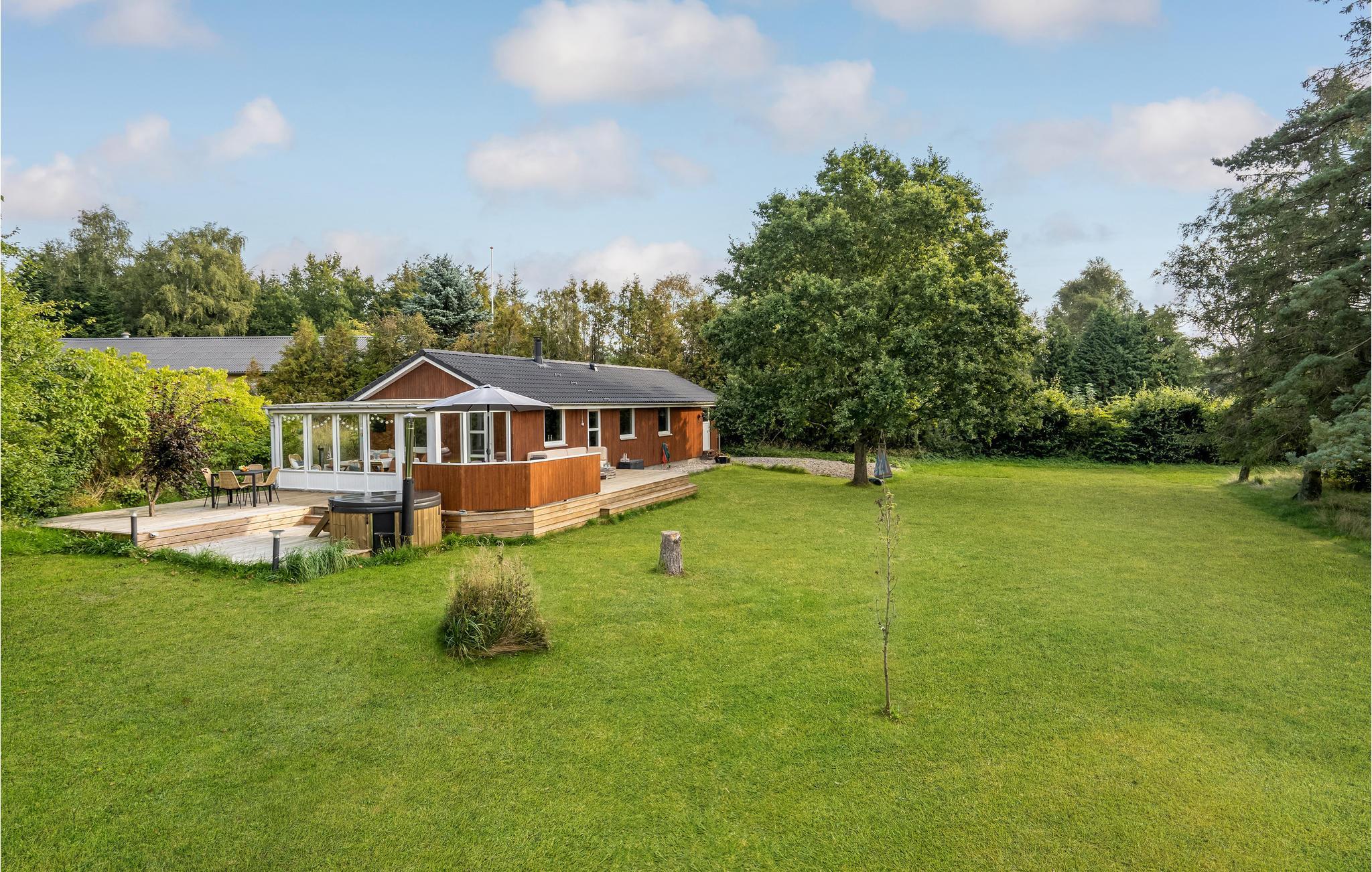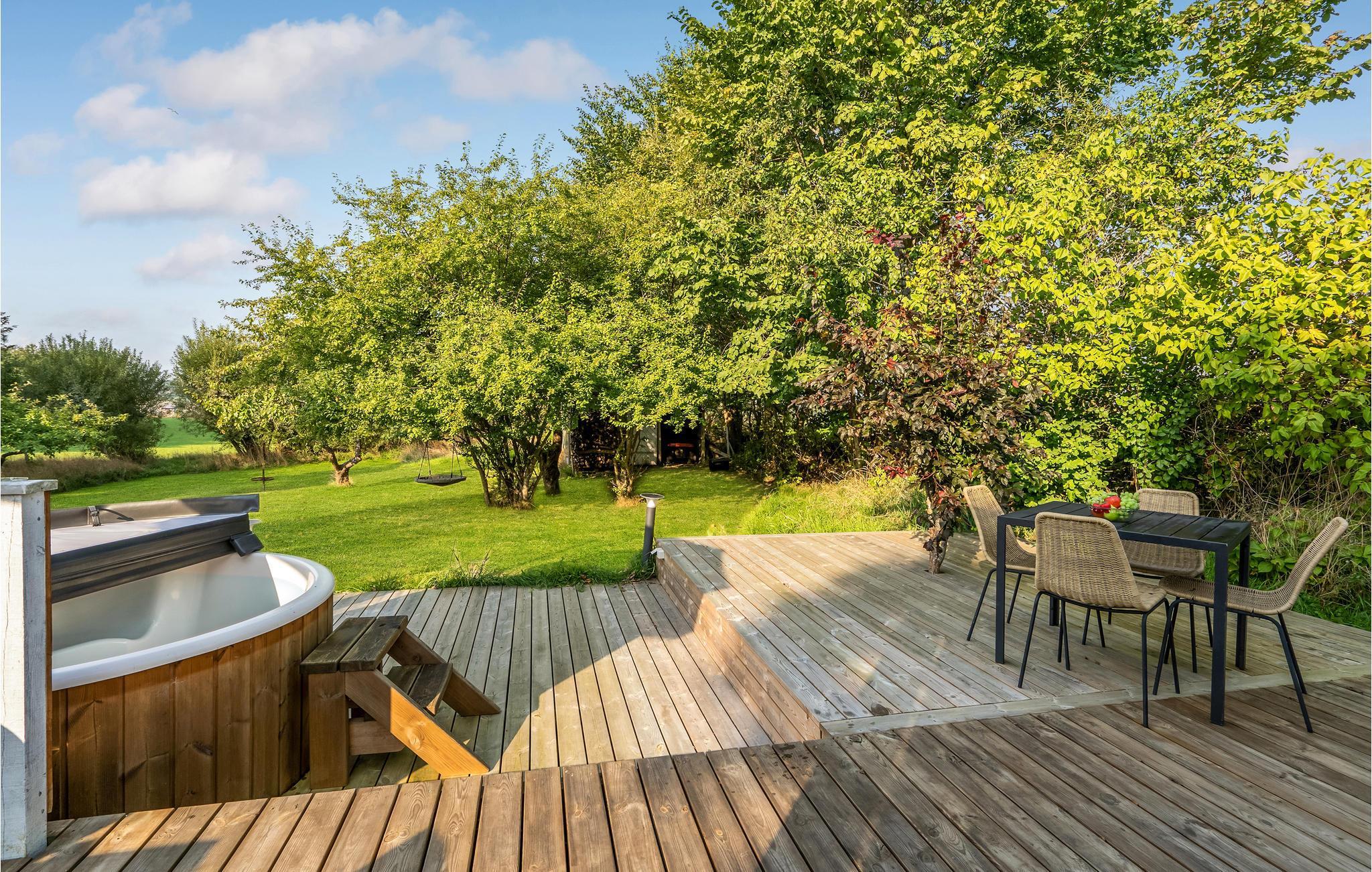 Godt feriehus med stor træterrasse og vildmarksbad.
