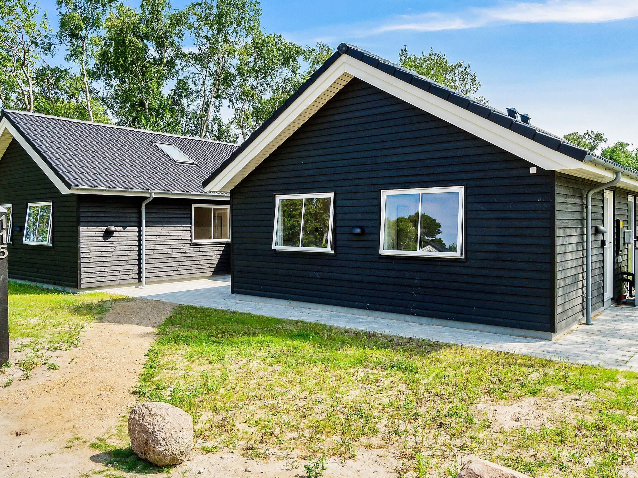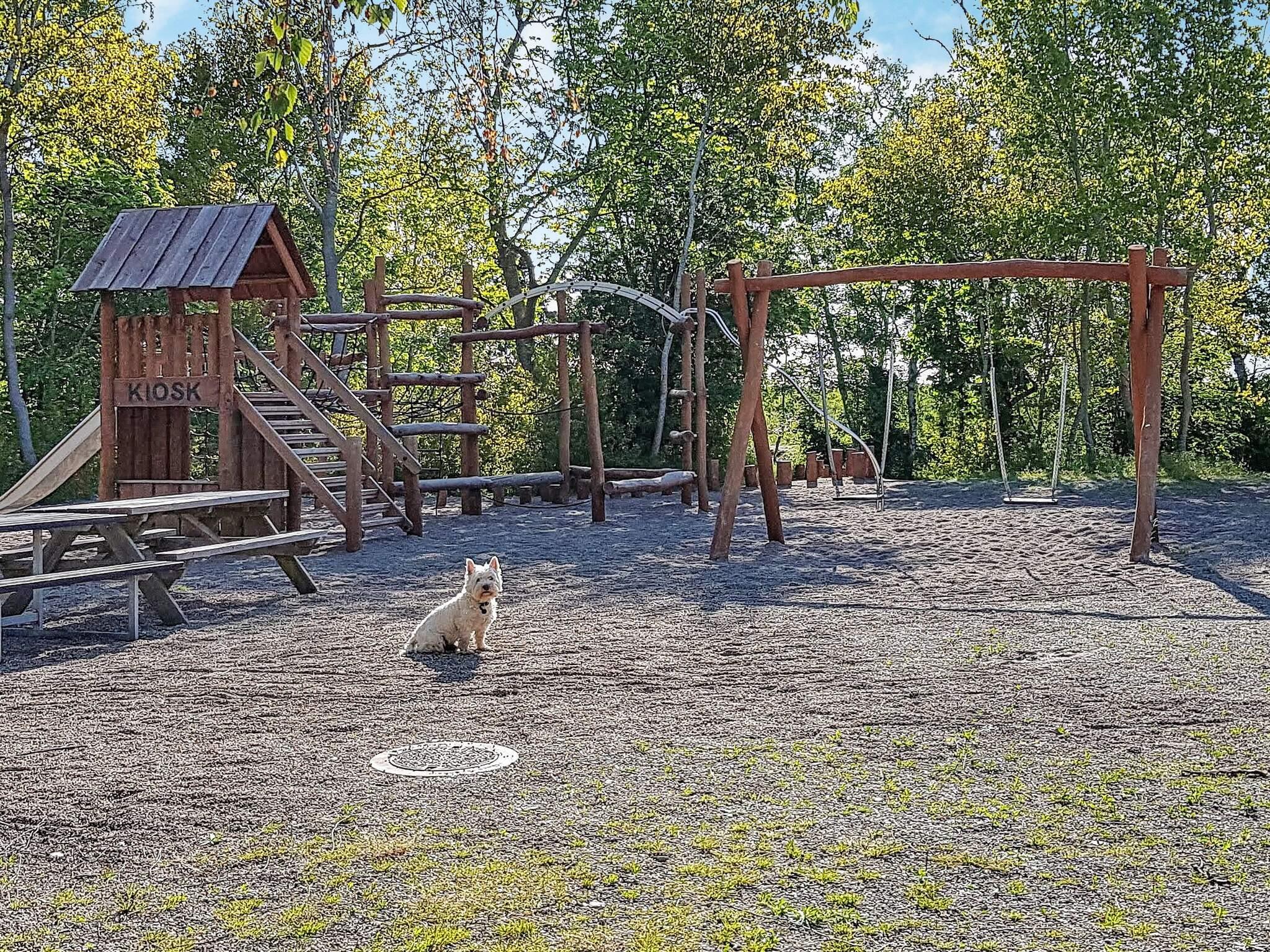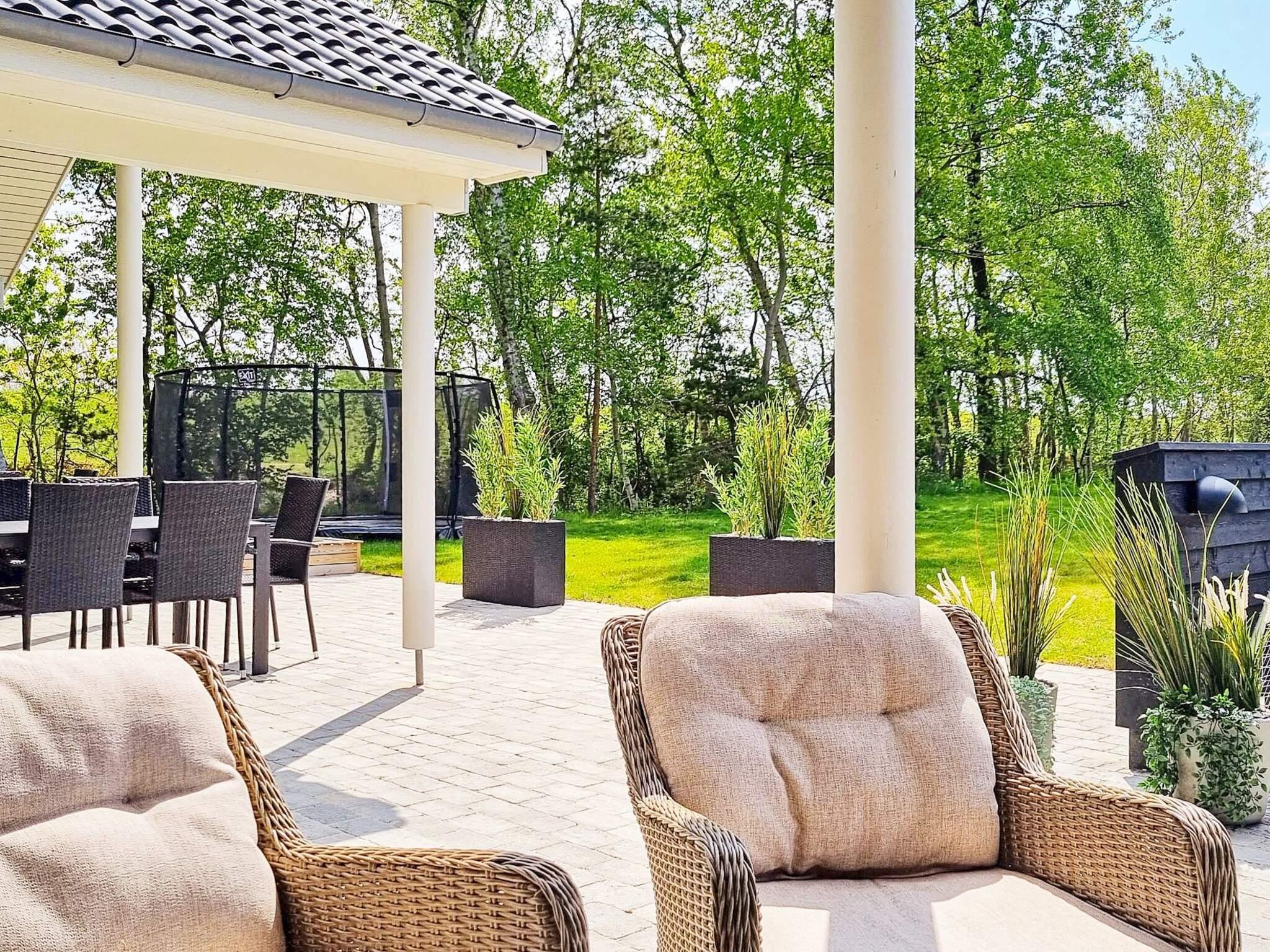Udenfor er der også god plads til hygge og leg på den delvist overdækkede terrasse, som også indeholder havemøbler og grill. Børnene kan tillige lege i haven, som er anlagt som naturgrund, og huset har også sandkasse og egen nedgravet trampolin (benyttes på eget ansvar/forsikring). Det skal fremhæves, at ferieområdets fælleslegeplads ligger under 100 meter fra huset.
