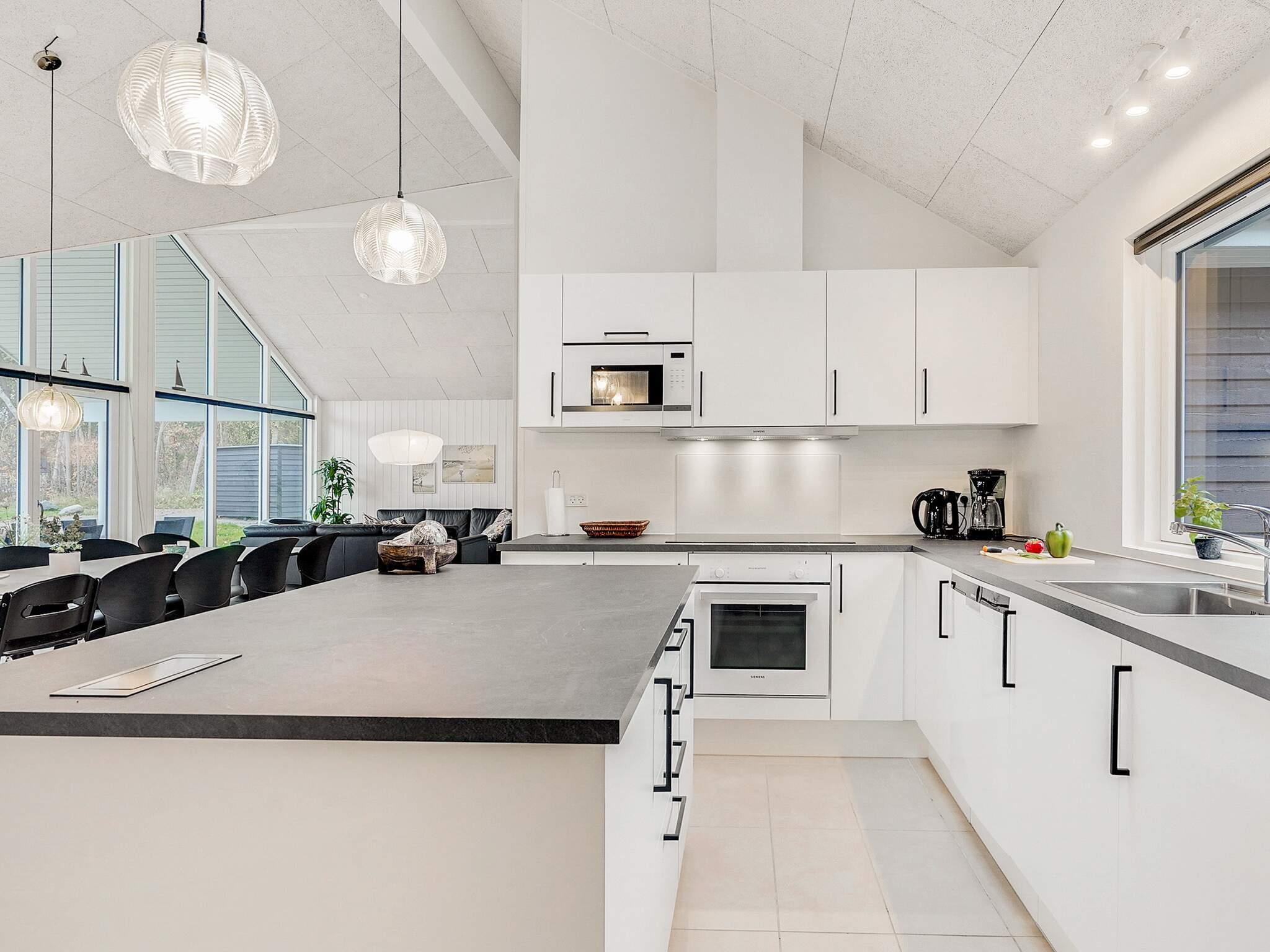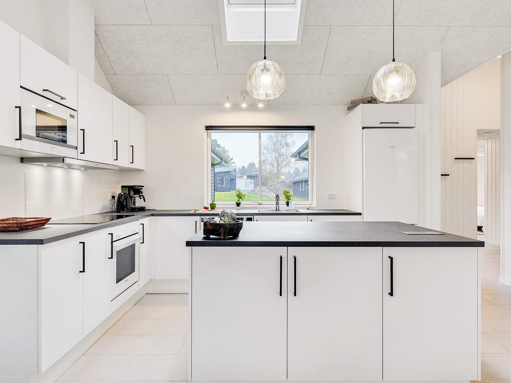 Husets midte, køkken/alrummet, er både rummeligt og veludstyret med bl.a. dobbelt ovn, opvaskemaskine og køleskab. Udover den rigelige plads til de flittige kokke er der også god plads ved det lange spisebord foran brændeovnen, hvor der kan dækkes flot op til feriemad eller festlige begivenheder.