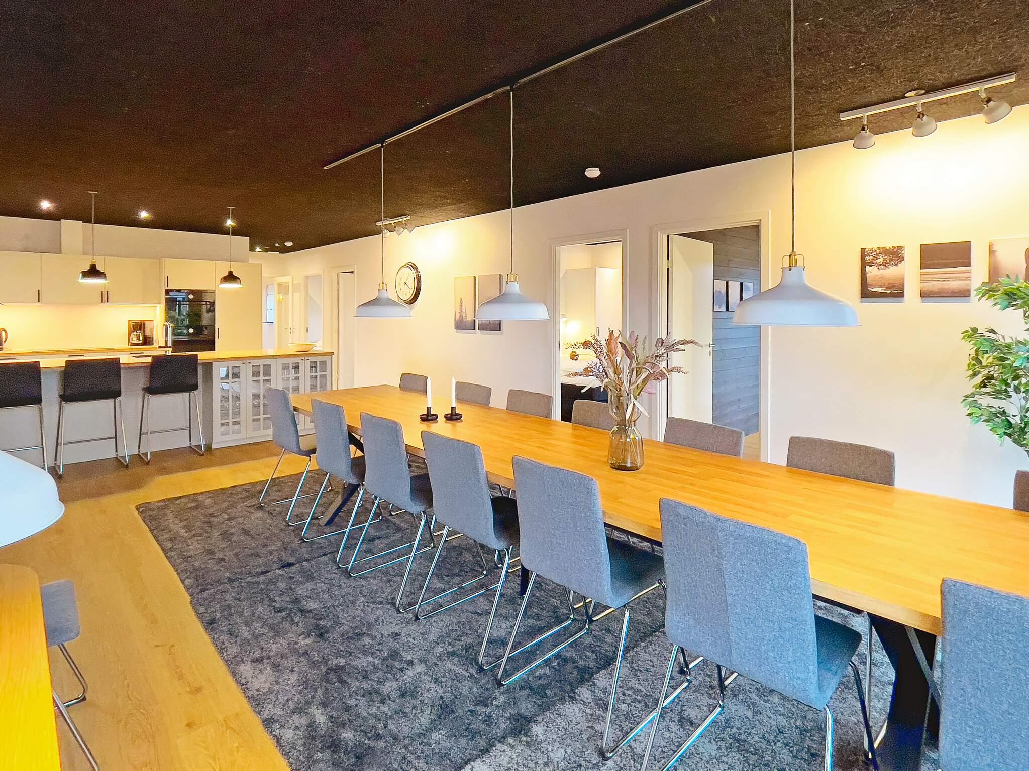 Der er fire soveværelser med dobbeltsenge (180 cm), eget klædeskab og direkte udgang til den store træterrasse, samt tre hemse med hver to enkeltsenge. Huset har to badeværelser, et ekstra toilet, vaskemaskine, tørretumbler og gulvvarme overalt via energivenlig luft/vand varmepumpe. Fra terrasserne kan solen nydes hele dagen – syd- og vestvendte områder med grill og overdækkede hyggekroge med terrassevarmere, samt en østvendt terrasse til morgenkaffen. På den store naturgrund er der fodboldmål, rig plads til leg og to elbilopladere (type 2).