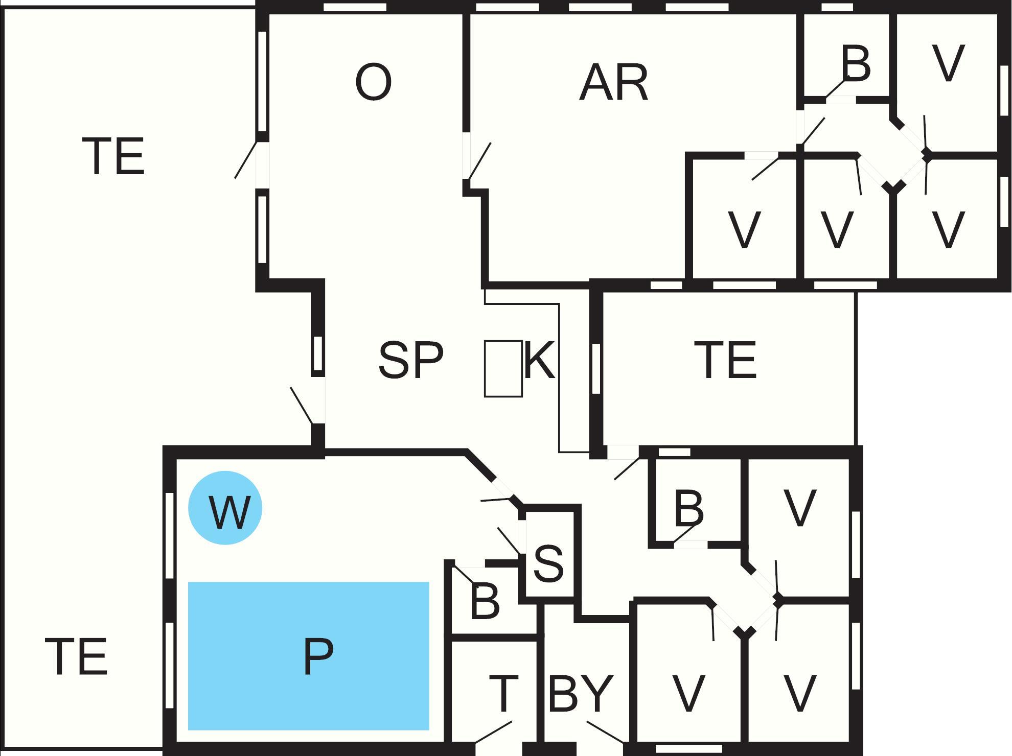 7 Soveværelser: (1DS)+(1DS)+(2S)+(2S)+(2S)+(2S)+(2S)