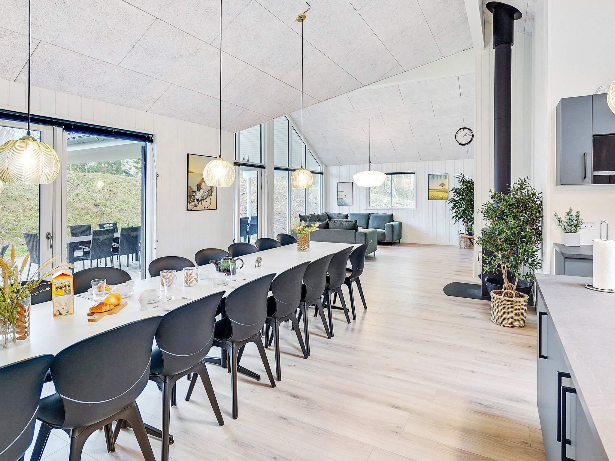 Fra entréen kommer man ind i køkken-alrummet, som er centrum i sommerhuset. Her er der højt til loftet og god plads omkring spisebordet, så alle kan samles. Selve køkkenet er også veludstyret med dobbelt ovn, køleskab, opvaskemaskine og ekstra kogeplader. I værelset finder I desuden en sofagruppe tæt på sommerhusets brændeovn, som kan sprede en hyggelig varme på kølige dage.