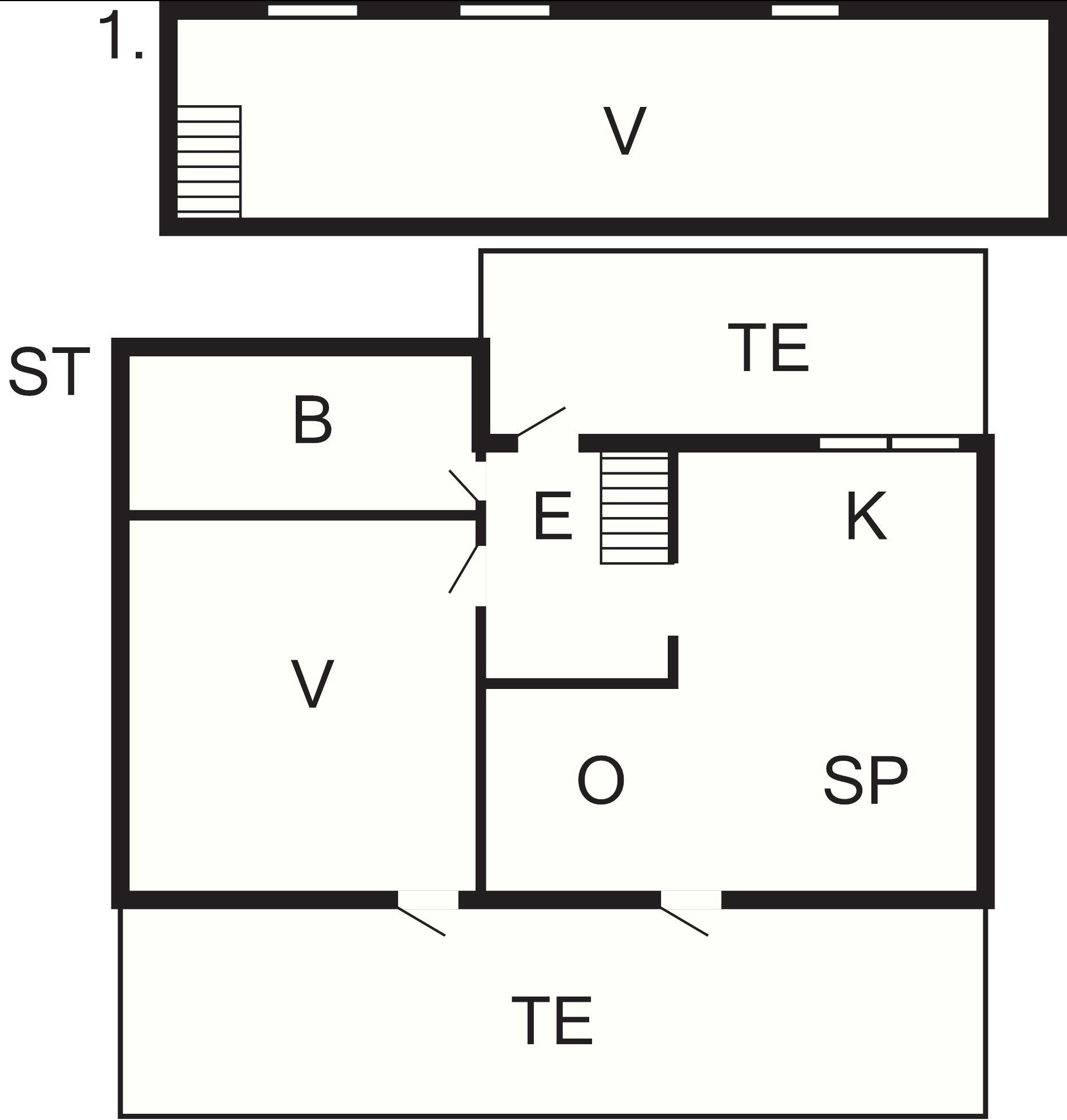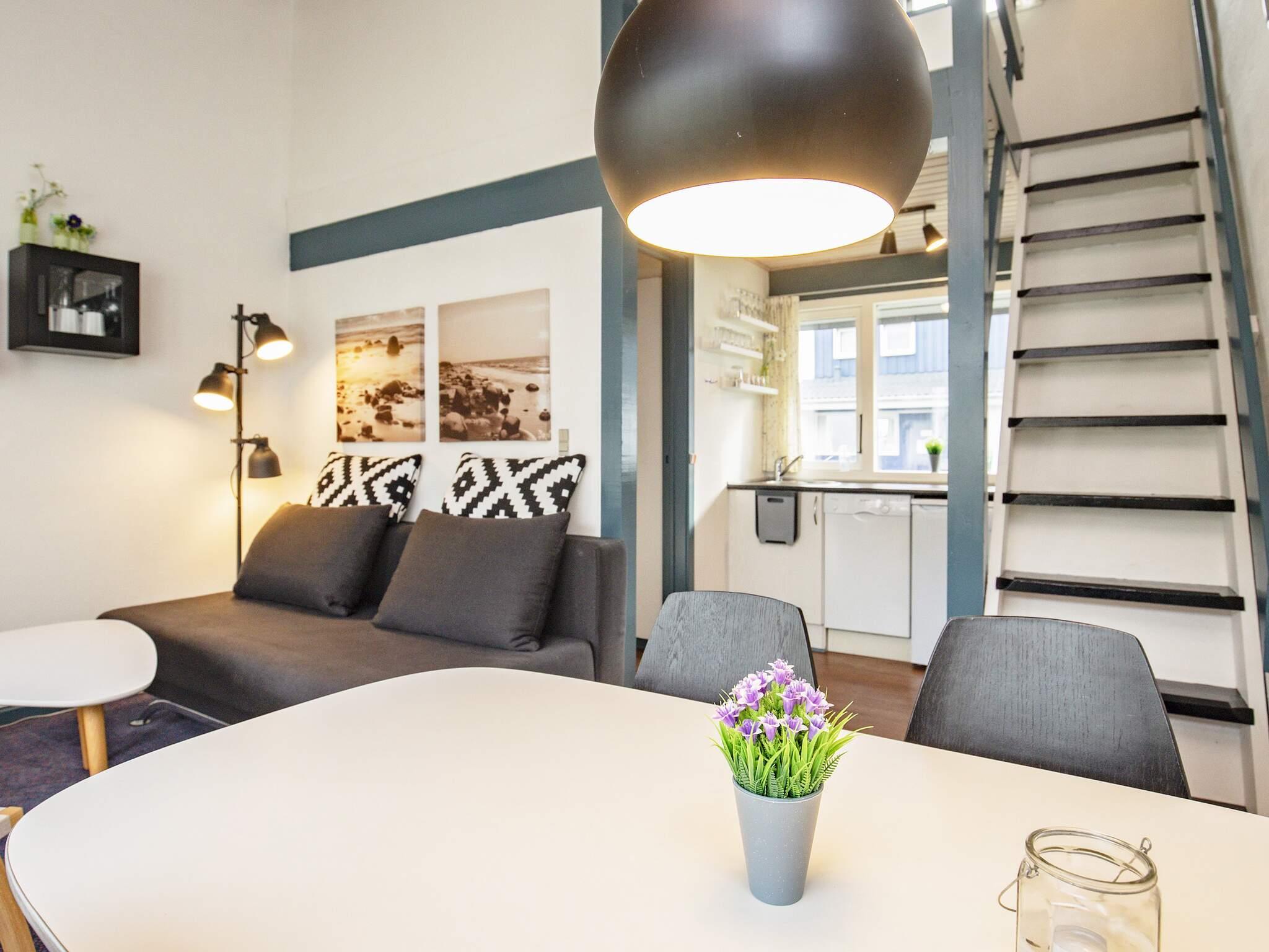 En trappe fører til første sal, hvor der er ekstra sovepladser med to enkeltsenge, hvilket gør huset velegnet til op til fire gæster. Layoutet sikrer både komfort og privatliv, uanset om du rejser som familie eller en lille gruppe.