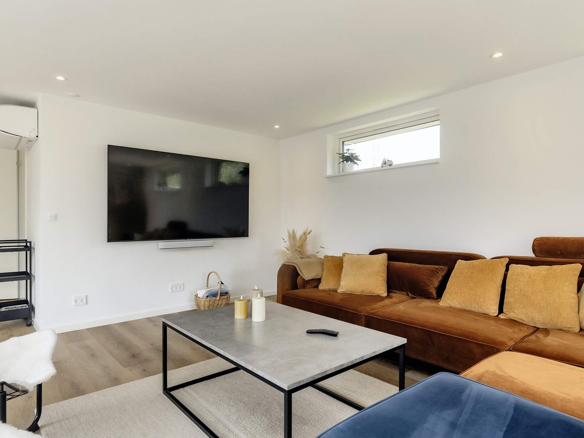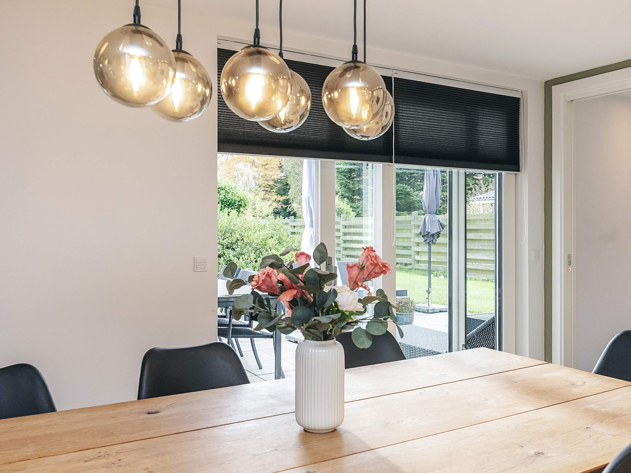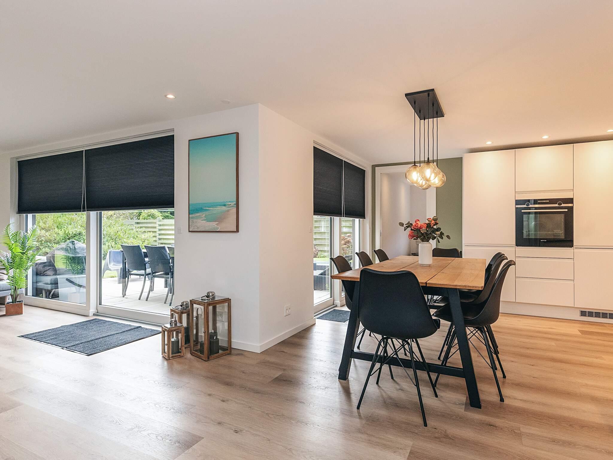 Køkkenet er i åbent plan og indeholder moderne hårde hvidevarer som Quooker, 90 cm induktionskomfur, opvaskemaskine, indbygningsovn, emhætte, køleskab og fryser. Stuen er lys med store skydedøre, der fører ud til husets store terrasse og indeholder et 72 smart-tv, brændeovn, diverse spil, samt en stor sofa til afslapning. Har du små børn, er der lidt legetøj i huset og en trækvogn til fri afbenyttelse.