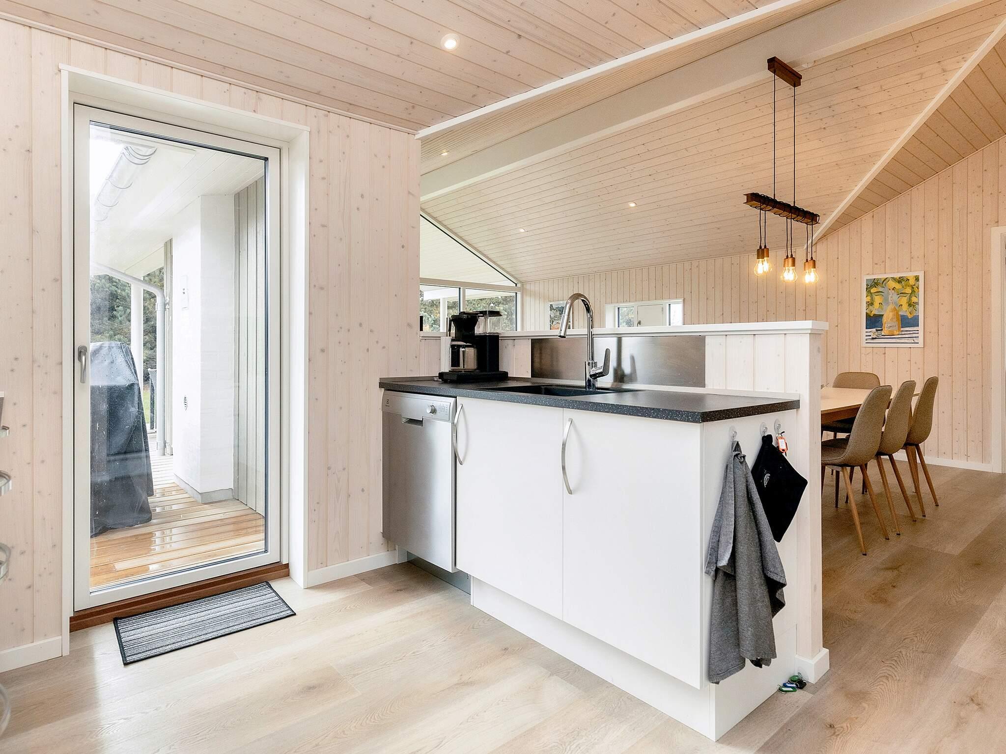 Den hyggelige stue er kombineret med et moderne køkken, som omfatter induktionskomfur, kaffemaskine, separat ovn, mikroovn, køleskab, 60-liters fryser og opvaskemaskine. I stuen er der smart-tv og trådløst internet, samt brændeovn og alkove tæt på spisebord og køkken, så de små gæster er tæt på.