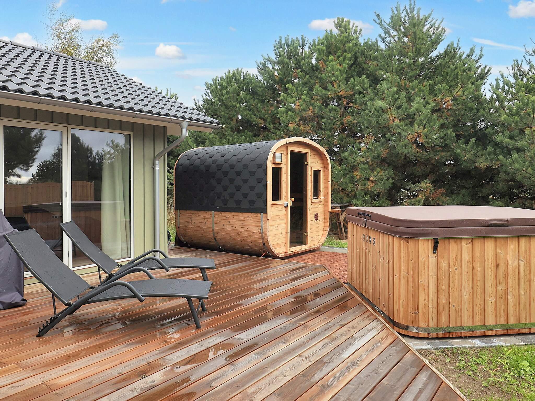 Grunden er på 1500 m2, så der er god plads til leg og leg. I haven er der 2 fodboldmål, en sandkasse og masser af udendørs spil. Der er også et stort udendørs spabad til 6 personer, som kan bruges hele året rundt. Du kan gå direkte fra det udendørs spabad ind i den varme sauna eller bruge den udendørs bruser.