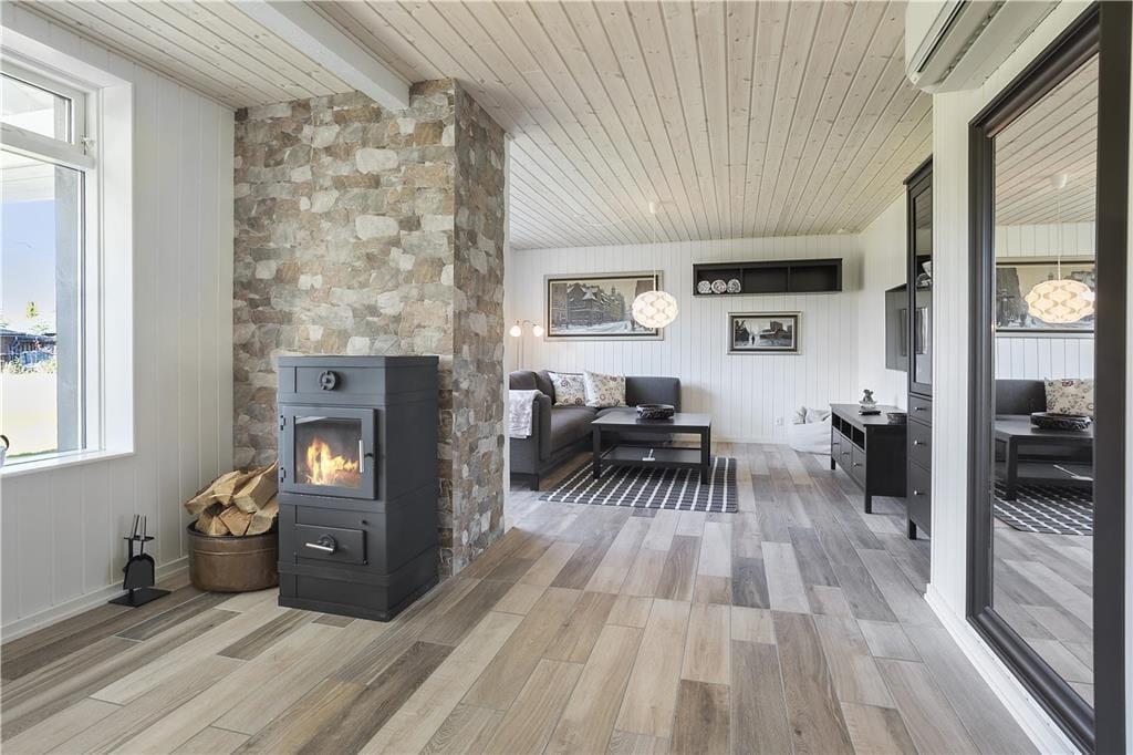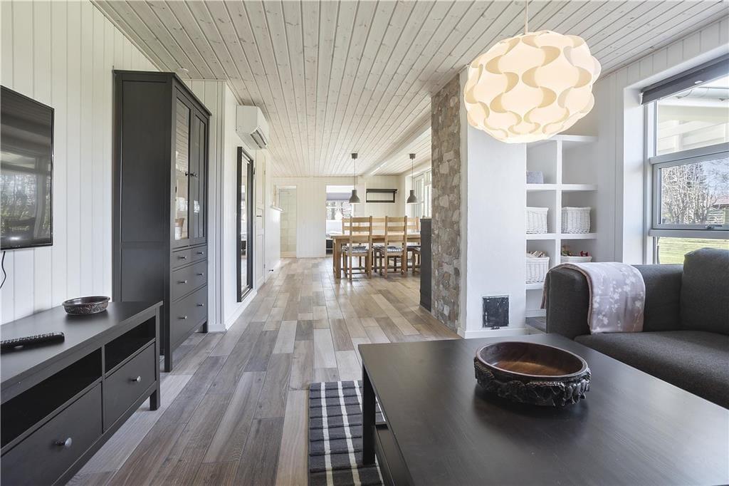 Husets lange stue er opdelt med en spiseafdeling nær køkkenet, og en stor sofa afdeling i den anden ende. Hele stuen er indrettet med store vinduer ud mod haven og terrassen.