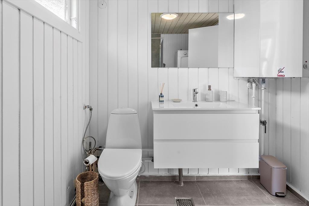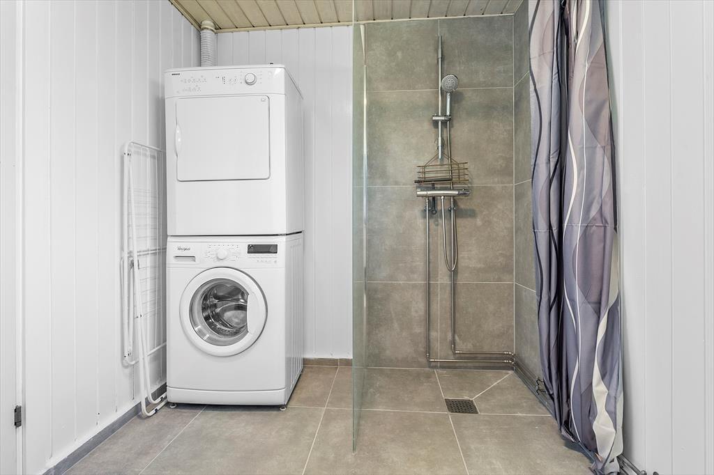 Fra stuen er der udgang til en hyggelig delvist overdækket terrasse, samt udgang fra køkkenet til en lille terrasse og haven.