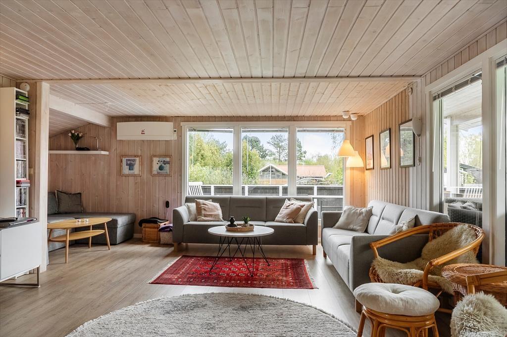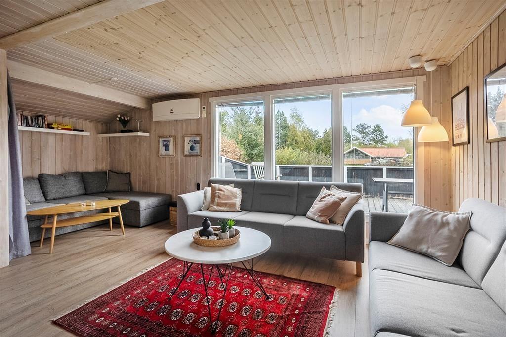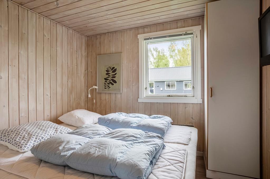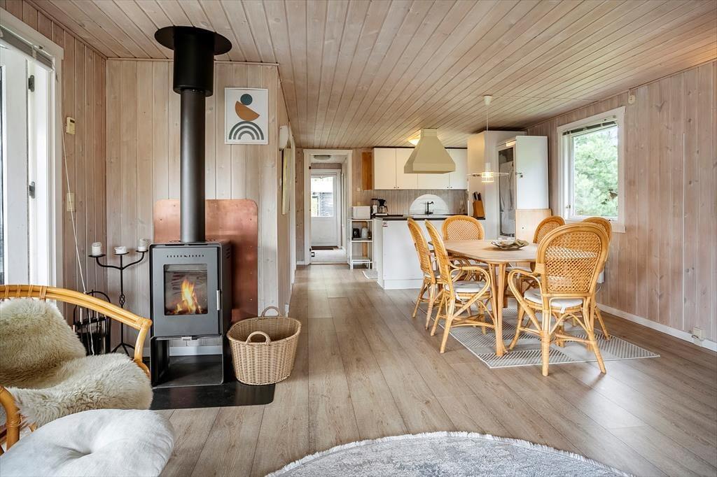 Fritidshuset indeholder: entré, 1 badeværelse med bruser og WC, 3 gode soveværelser med dobbeltsenge. Videre fra entreen kommer man til køkkenet som er i åben forbindelse med køkkenet-alrummet/stuen, som er opdelt med en spisebordsafdeling lige ved køkkenet, mens der i den anden ende sofa- og tv-afdeling, samt en alkove.