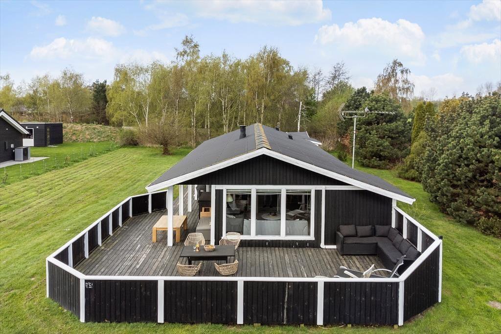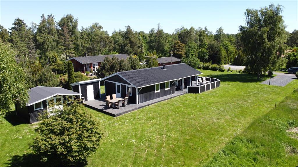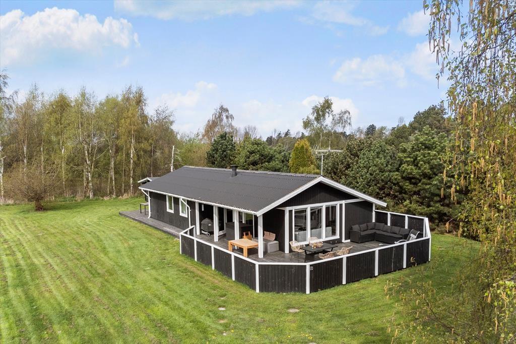 Fritidshuset er beliggende på en 1422 kvm stor grund med masser af græsplæne til boldspil og leg med børnene, eller til ren afslapning i sommersolen.