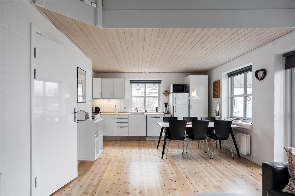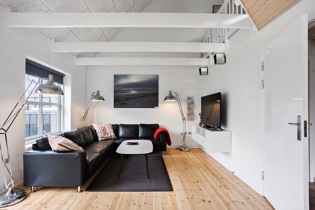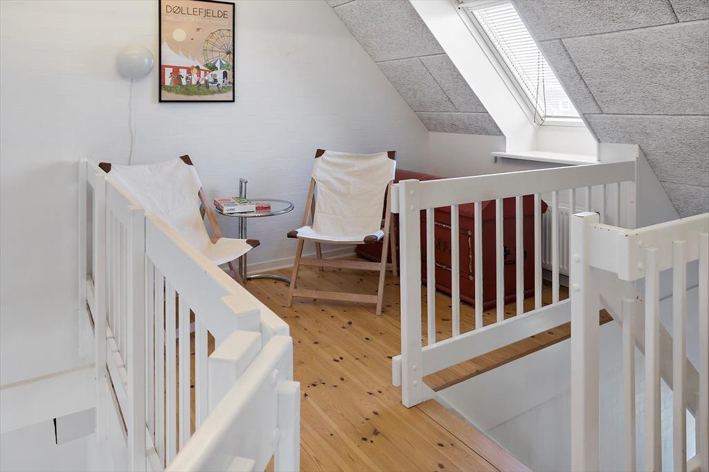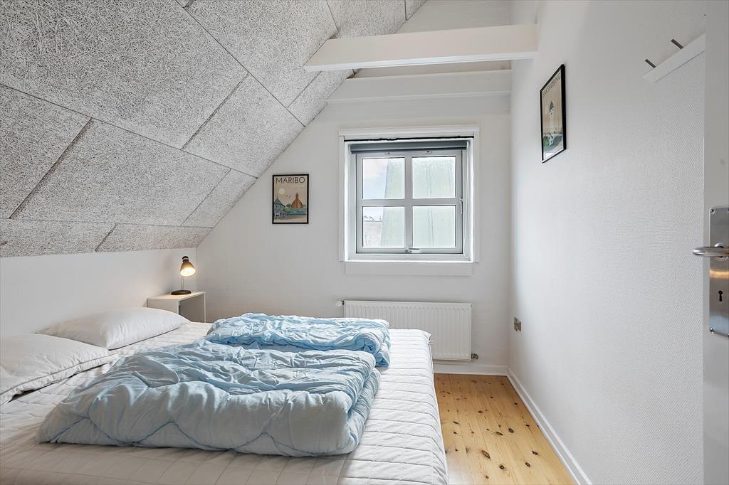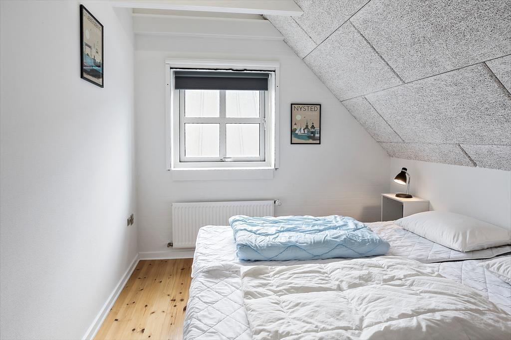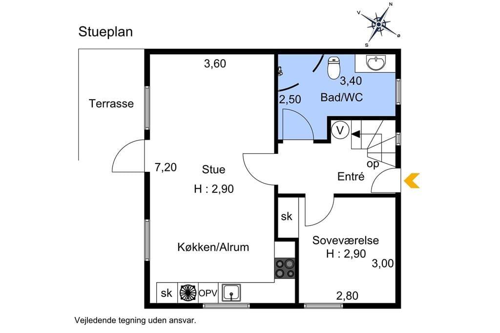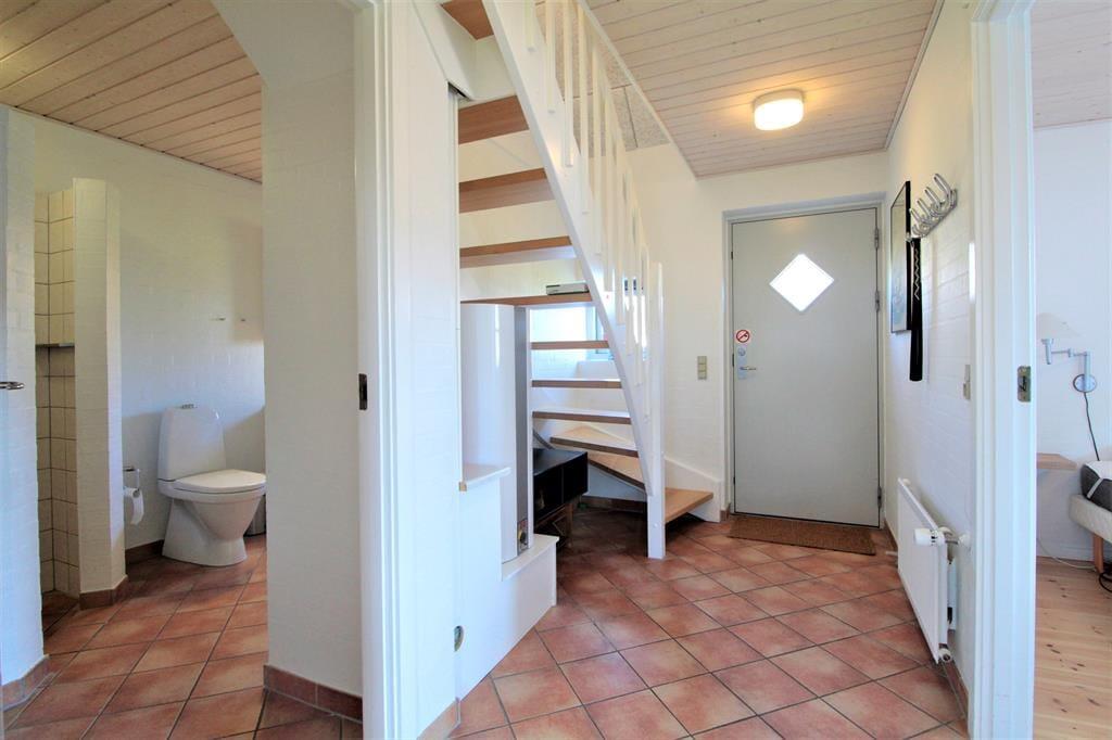 Stueplan: Entré med trappe til førstesal. Badeværelse med bruseniche, toilet og håndvask. Soveværelse med dobbeltseng. Åbent køkken med køleskab, opvaskemaskine og spisebord. Stue med sofa- og tvafdeling. Udgang til 10 m² åben terrasse med havemøbler og grill.
