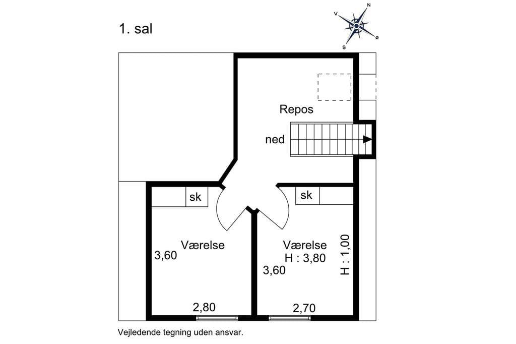 1 sal: Repos med skrivebord. 1 soveværelse med dobbeltseng og 1 soveværelse med 2 enkeltsenge.