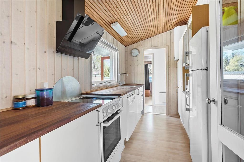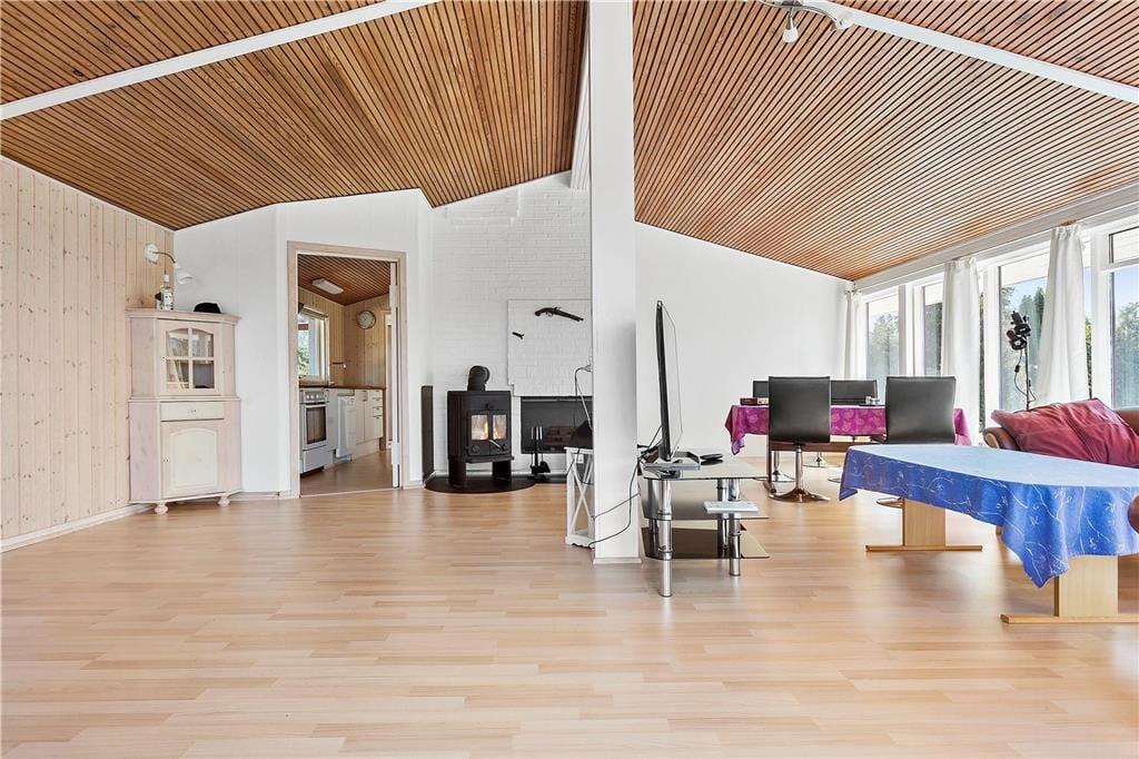 Entré, 3 værelser, pænt badeværelse med brusekabine og vaskemaskine, dejligt køkken i delvist åben forbindelse til den store lyse stue med god brændeovn og varmepumpe, fra stuen er der direkte udgang til flere træterrasser og den flotte have.