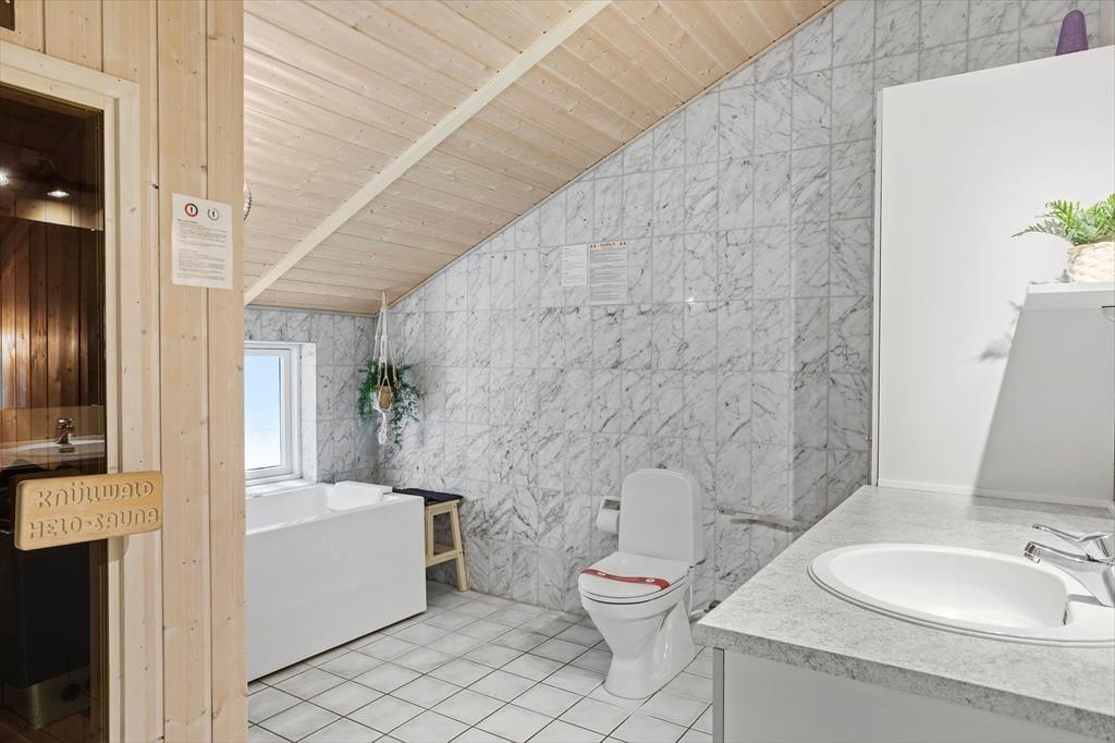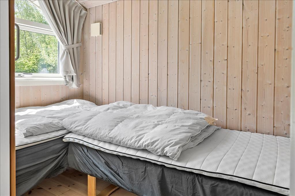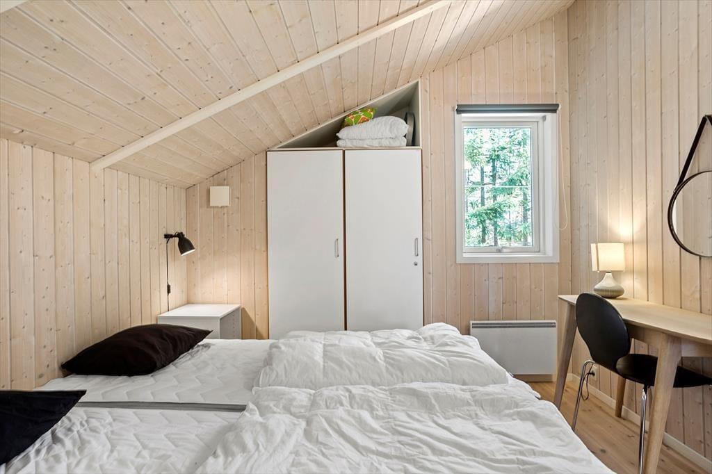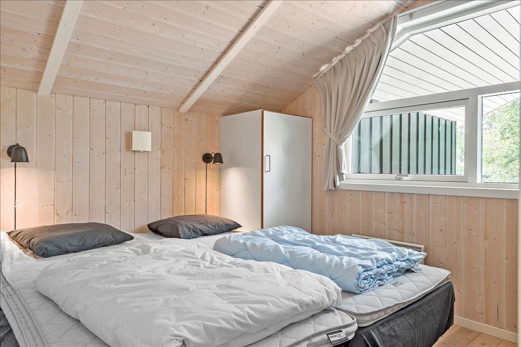Fritidshuset byder på 4 værelser: 2 store værelser med dobbeltsenge og 2 mindre værelser på ca. 6 kvm. med 2 enkeltsenge på hver, 1 stort badeværelse med spa, sauna, wc og bruser, samt et lille badeværelse kun med wc, åbent køkken indtil stuen hvor der er spiseområde, sofaarrangement og udgang til en delvist overdækket terrasse. Velegnet til 4 voksne og 4 børn.