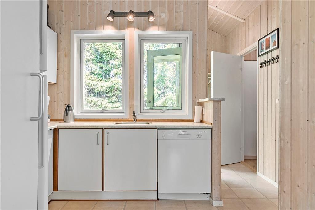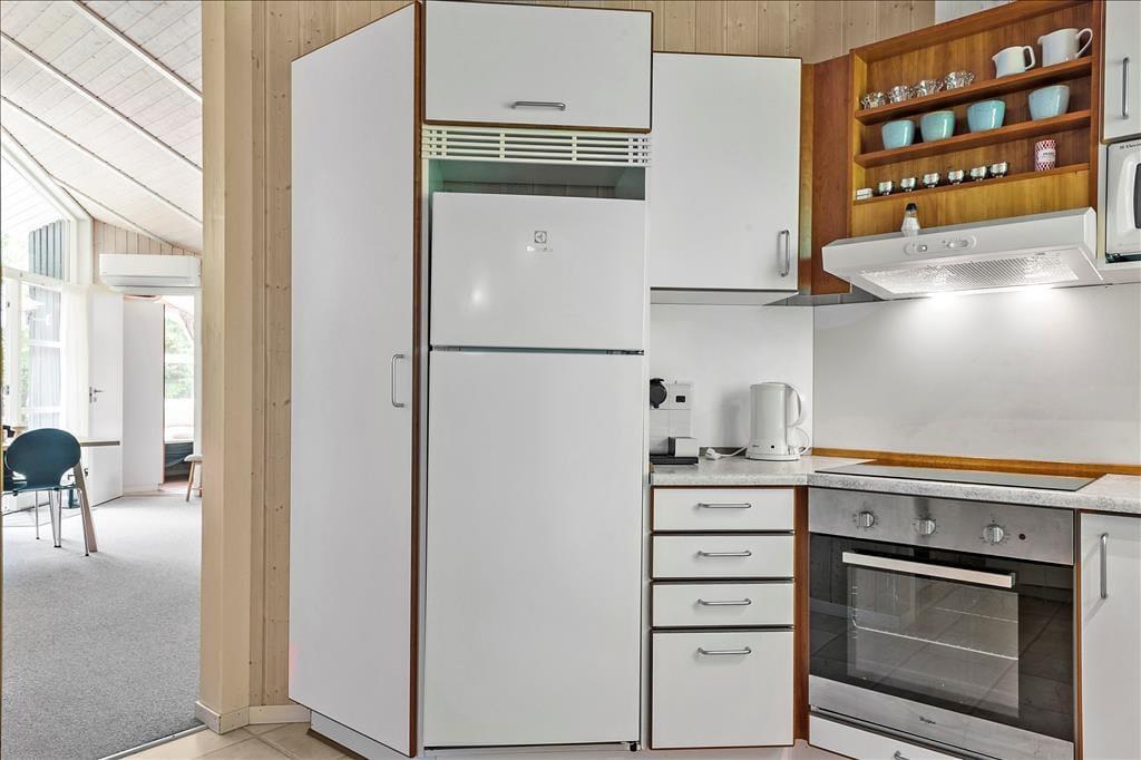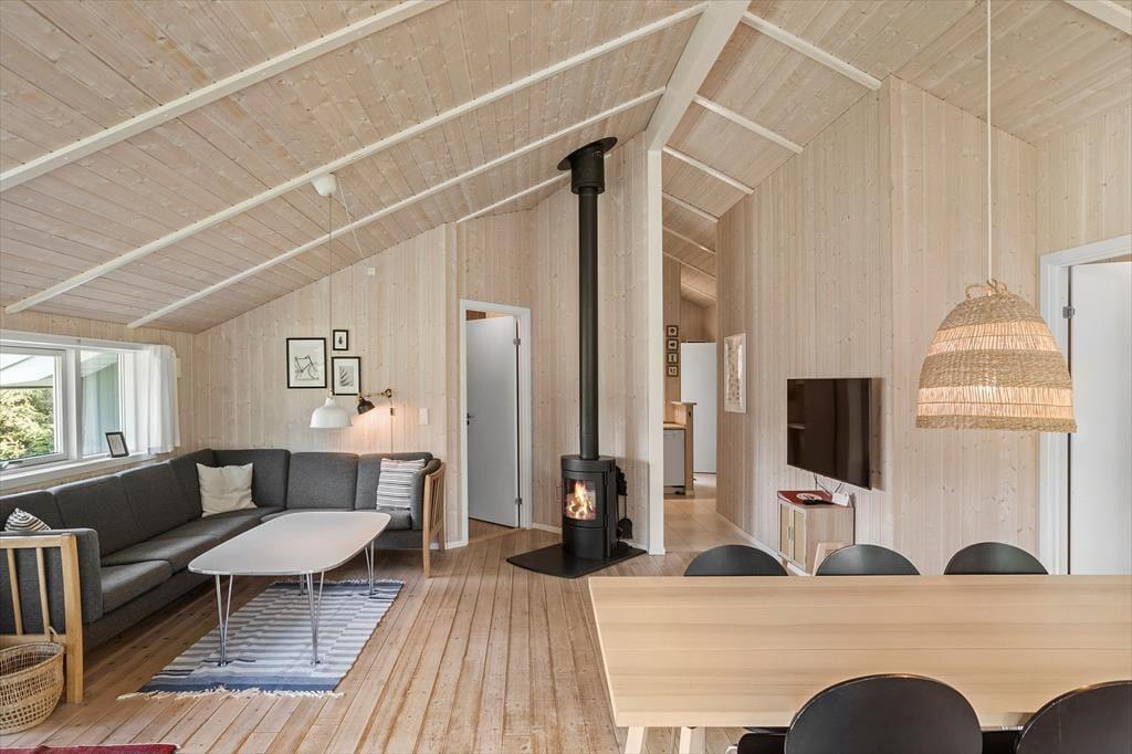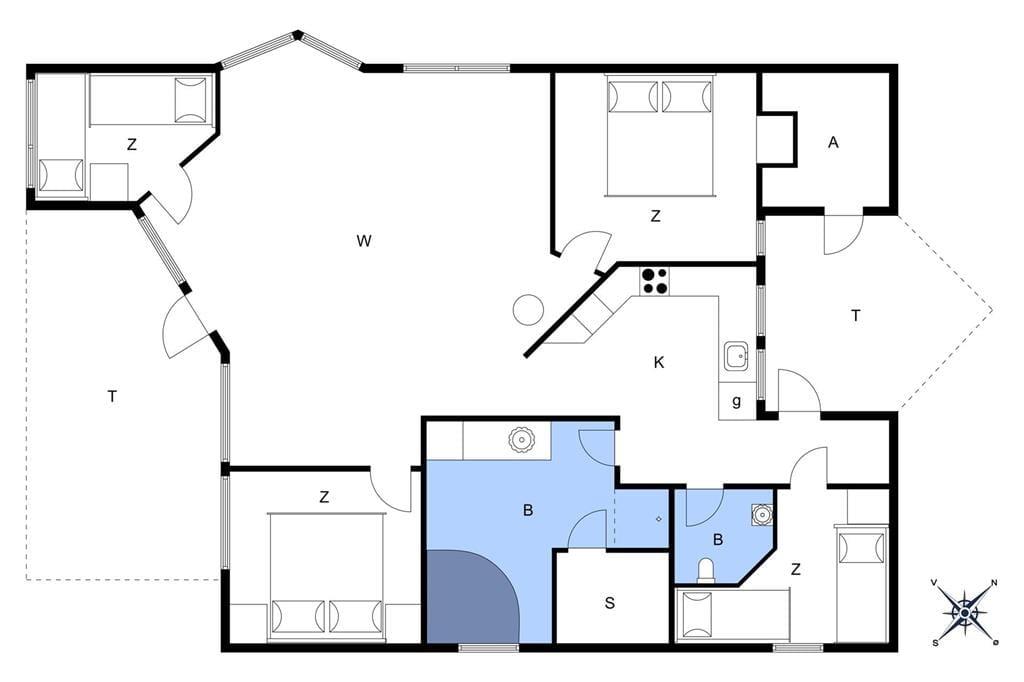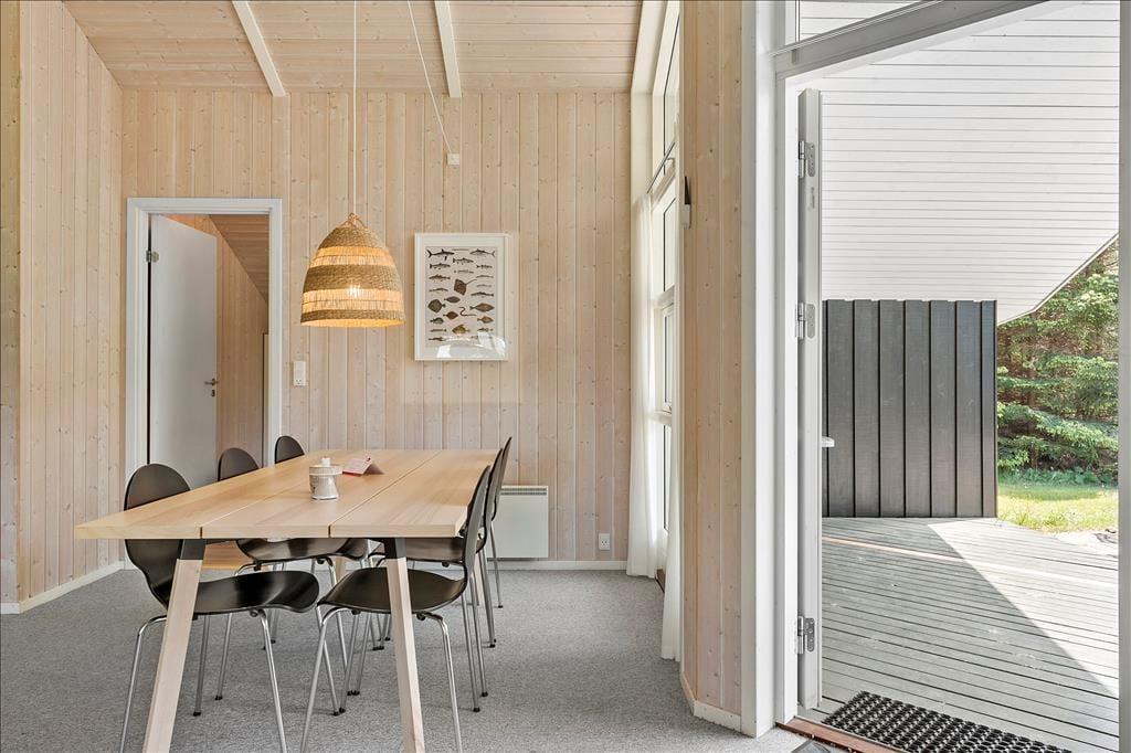 Fritidshuset byder på 4 værelser: 2 store værelser med dobbeltsenge og 2 mindre værelser på ca. 6 kvm. med 2 enkeltsenge på hver, 1 stort badeværelse med spa, sauna, wc og bruser, samt et lille badeværelse kun med wc, åbent køkken indtil stuen hvor der er spiseområde, sofaarrangement og udgang til en delvist overdækket terrasse. Velegnet til 4 voksne og 4 børn.