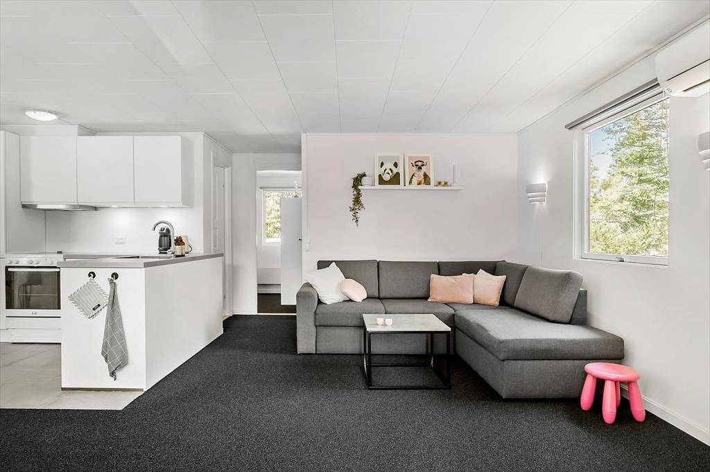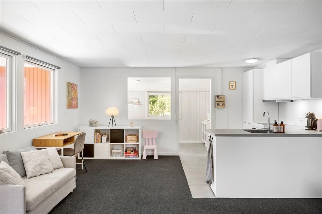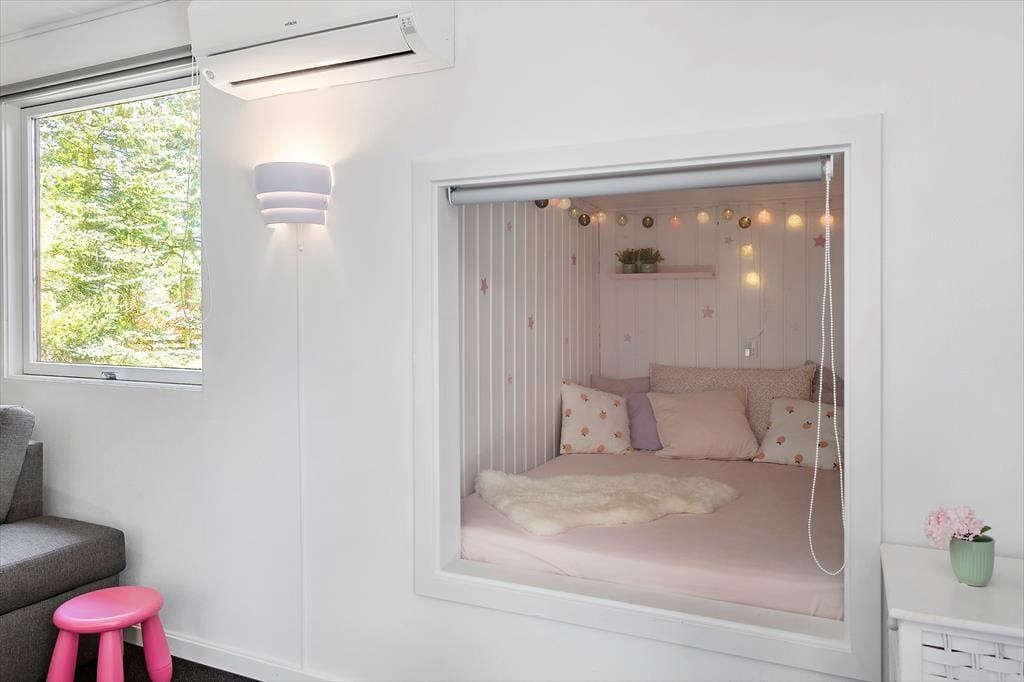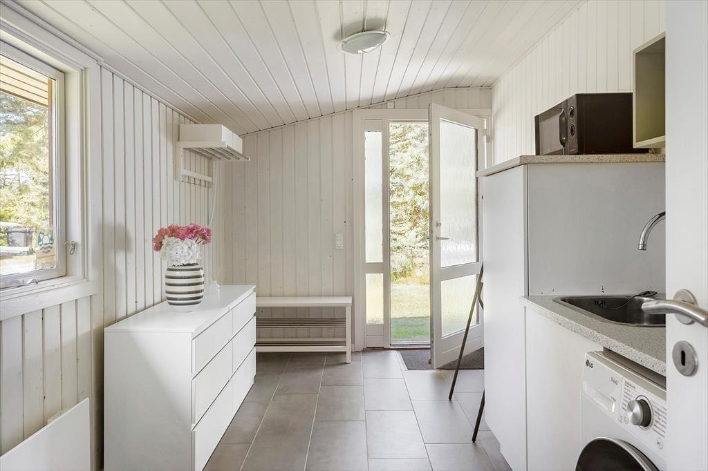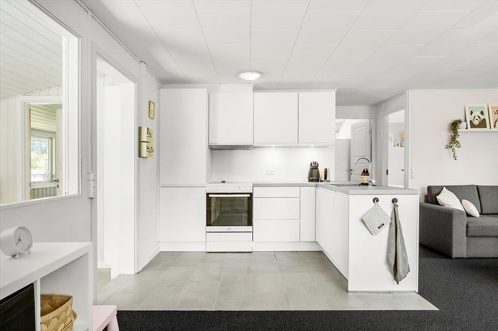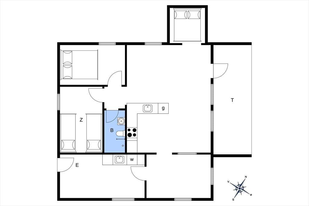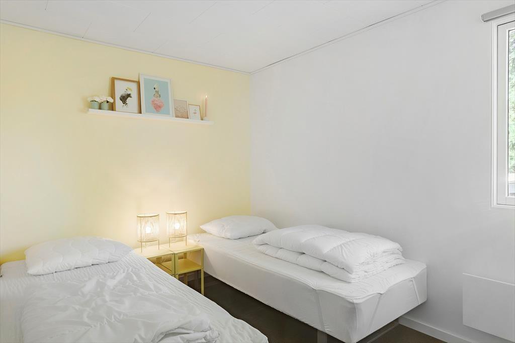 Feriehuset indeholder: Entre/bryggers, 2 soveværelser, det ene soveværelse er med dobbeltseng og det andet soveværelse er med 2 enkeltmandssenge, 2 sovepladser i alkove i stuen. Køkken-alrum med spiseafdeling og sofaarrangement, samt et badeværelse med bruser og toilet.