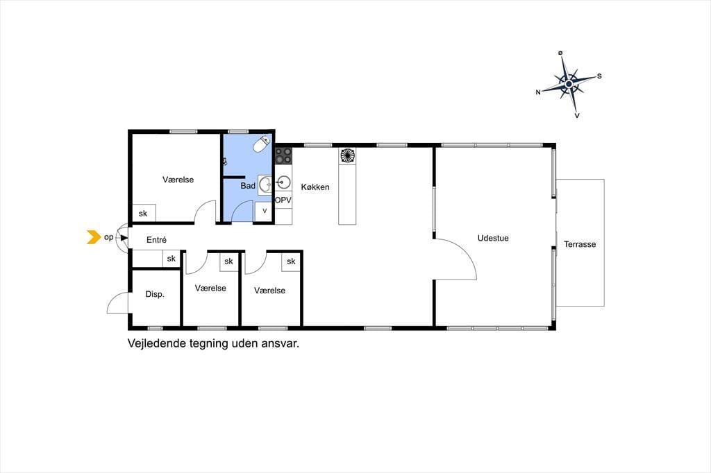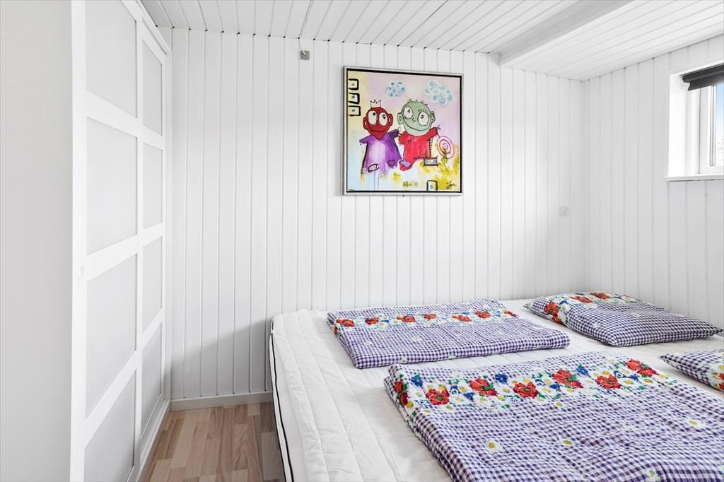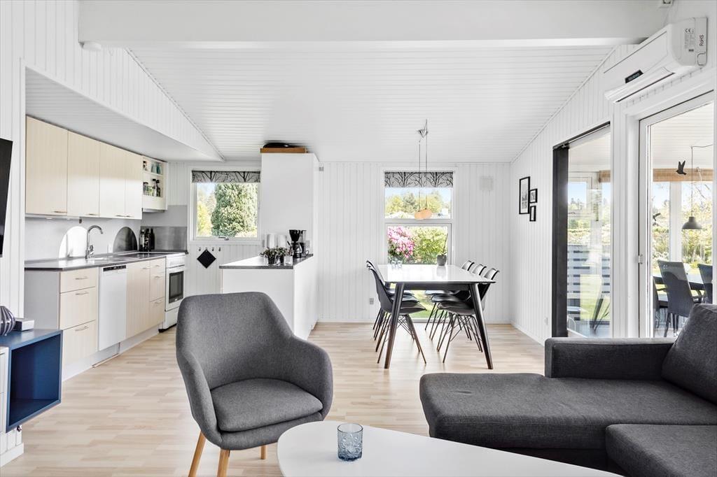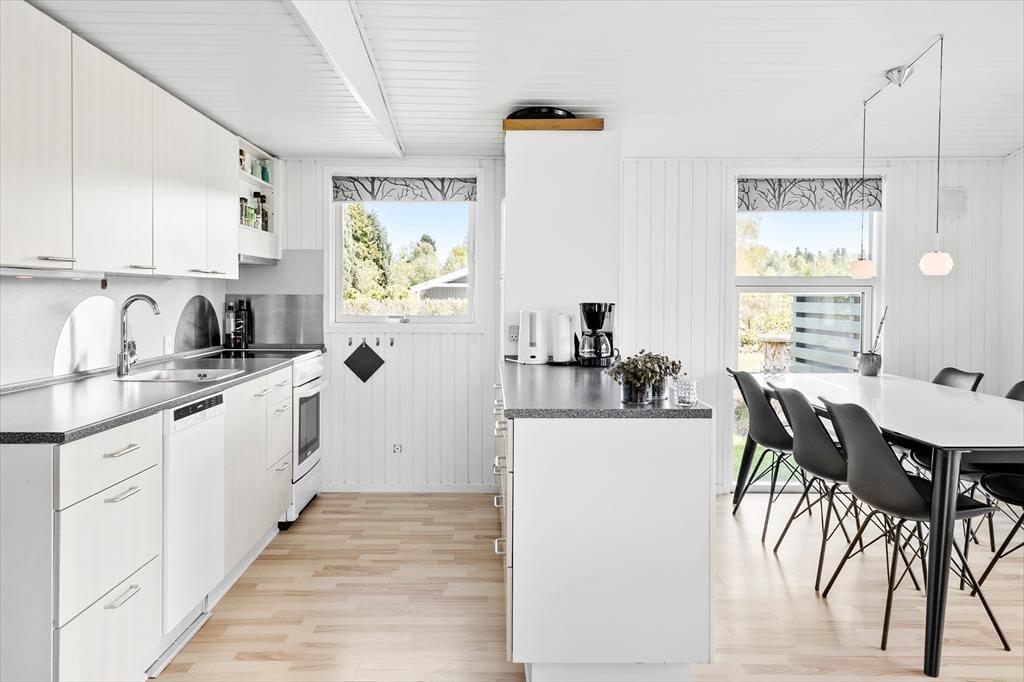 Nydeligt fritidshus som er indrettet med en entré / fordelingsgang, hvor der er adgang til husets nyrenoverede badeværelse og husets 3 soverum, alle med en dobbeltseng. Videre gang fra fordelingsgangen, kommer man til køkkenet, som fremstår i pæne hvide elementer og hvor der ikke mangler noget. I åben forbindelse med køkkenet ligger stuen, som er opdelt med en spisebordsafdeling lige ved køkkenet, mens der i den anden side er en sofa- og tv-afdeling.