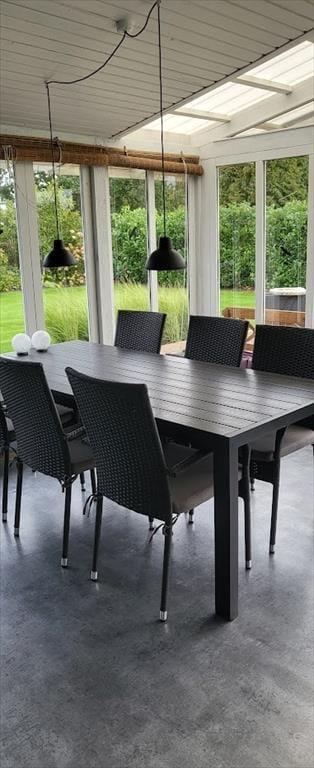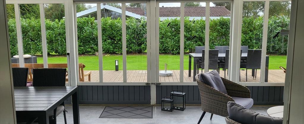 Fra stuen er der udgang til en dejlig udestue, og derfra videre udgang til terrasseanlægget og haven.