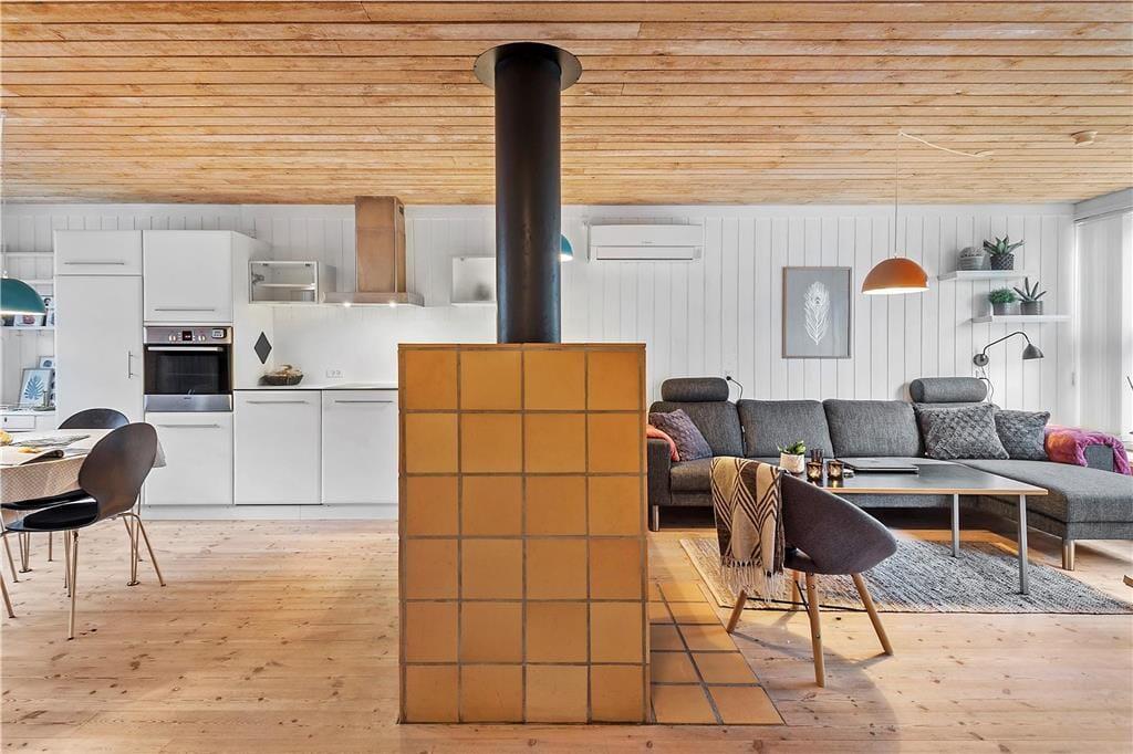 Stue i forlængelse af køkken med brændeovn og varmepumpe samt med udgang til terrasse hvor morgen-, middags- og eftermiddagssolen kan nydes.