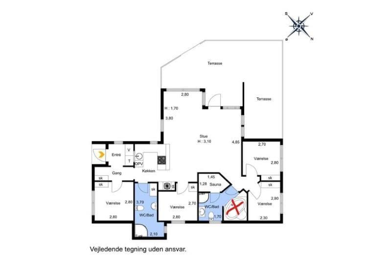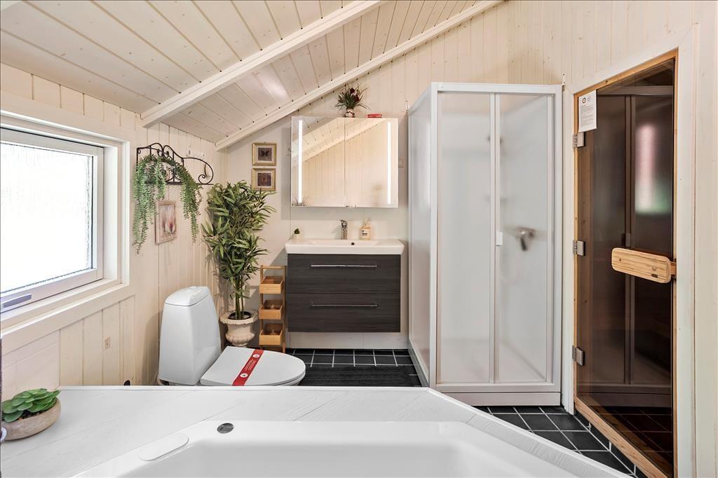 Fra stuen er der ligeledes adgang til 3 soveværelser, og endnu et badeværelse, som ikke bare indeholder et WC og en brusekabine, og en sauna.