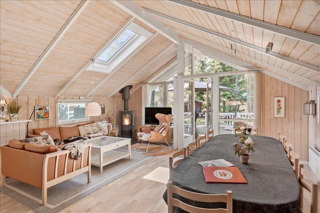 Den store og flotte stue, er godt opdelt og udnyttet med spisebord i den ene side, og en sofa og tv-afdeling i den anden side. For enden af stuen er der udgang til det dejlige terrasseområde, samt haven.