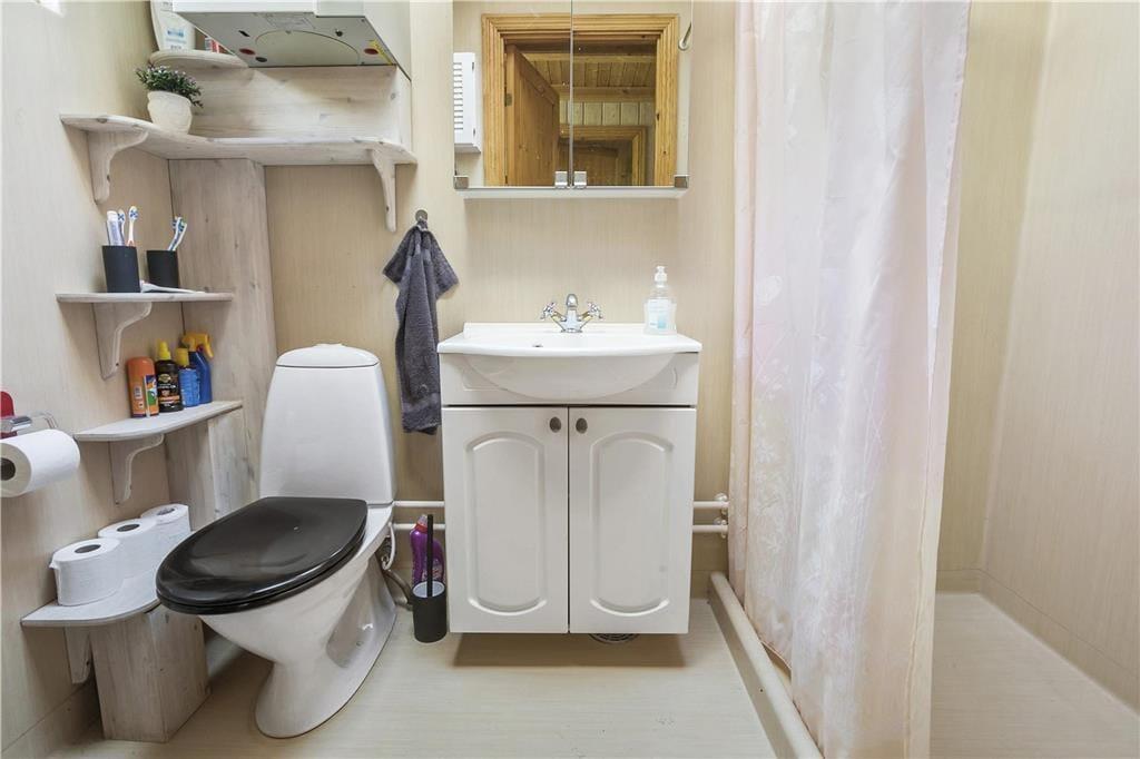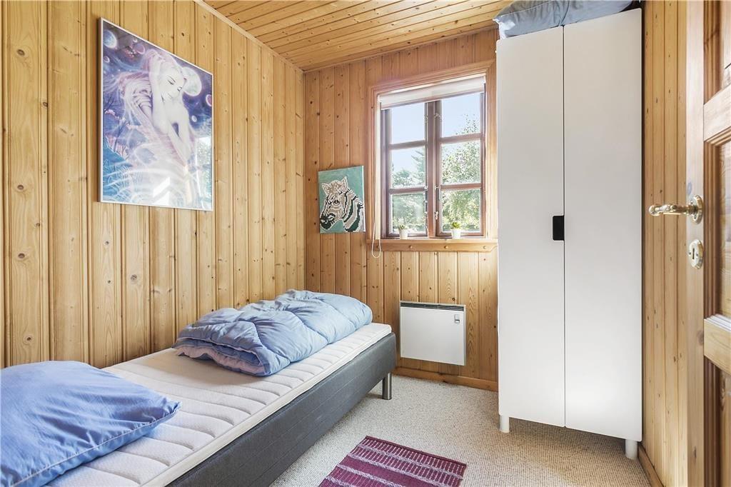 Adgang til en lille entré, hvorfra der er indgang til husets badeværelse, som indeholder håndvask, WC og bruser. Fra entréen er der også adgang til husets 3 soveværelser, som i alt indeholder 2 dobbeltsenge og 1 enkeltseng.