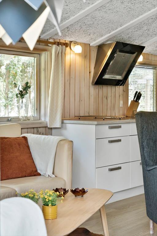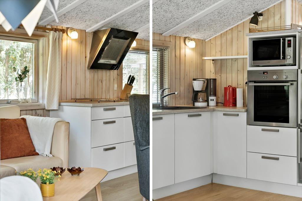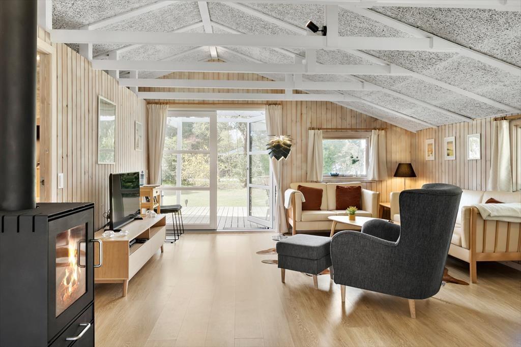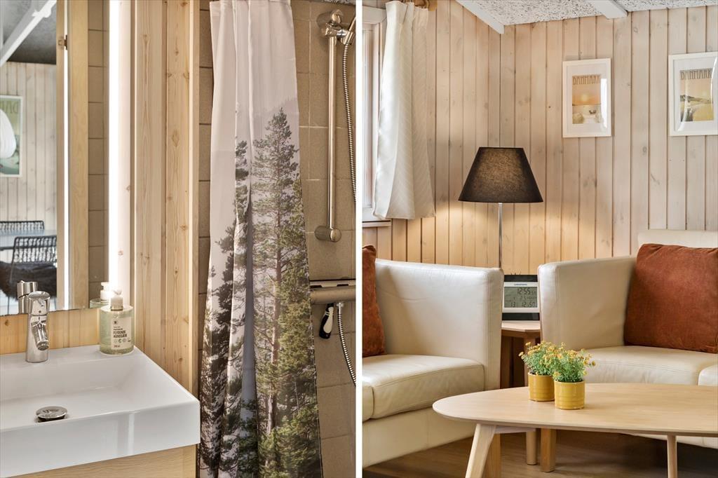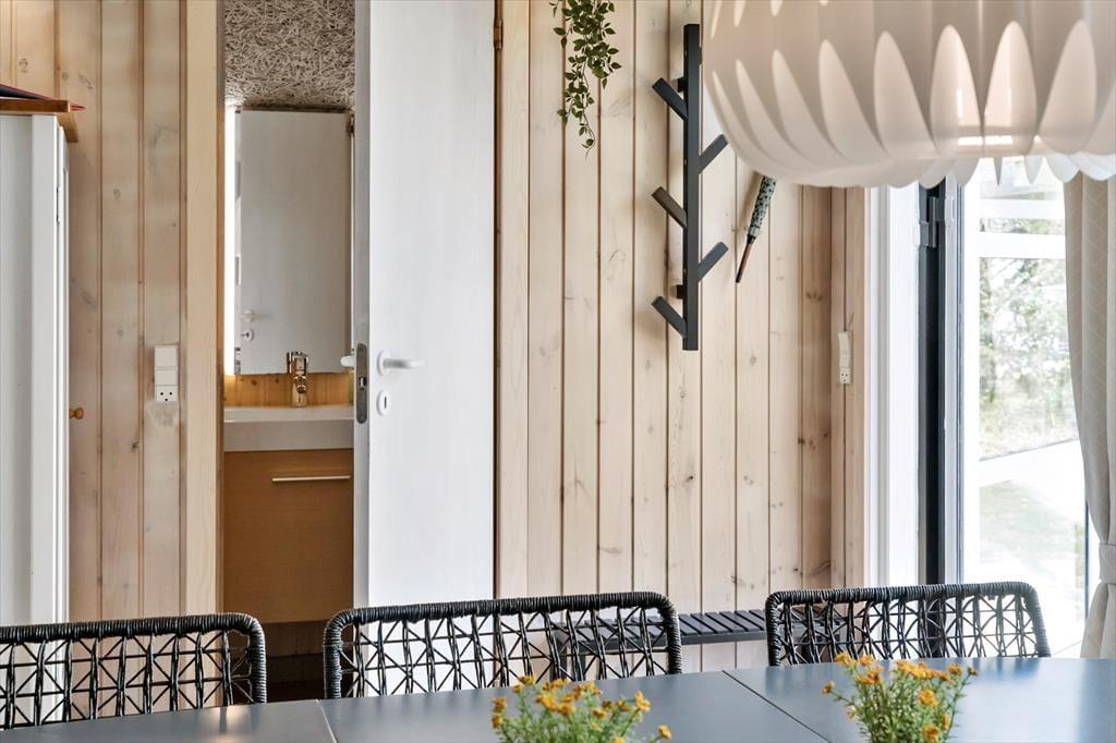 Indgang til huset fra den lille hyggelige terrasse på bagsiden af huset, hvor man træder direkte ind i husets skønne køkken-alrum, som tilbyder en spisebordsafdeling med god udsigt til haven, et top-moderne køkken fra 2020 samt adgang til nyrenoveret badeværelse fra 2021, som indeholder bruser, WC samt god gulvvarme og en håndklædervarmer/tørrer. Videre gang i huset ligger den pæne åbne stue, hvor både gulve og møbler er blevet udskiftet i 2020, og ydermere tilbyder en god brændeovn samt udgang til den delvist overdækkede træterrasse.