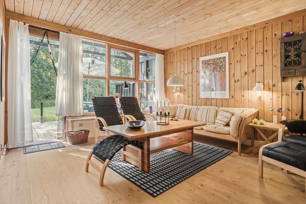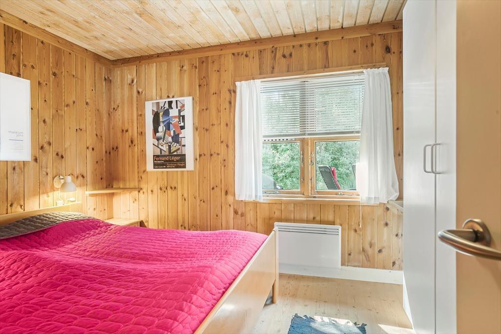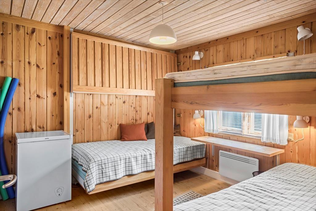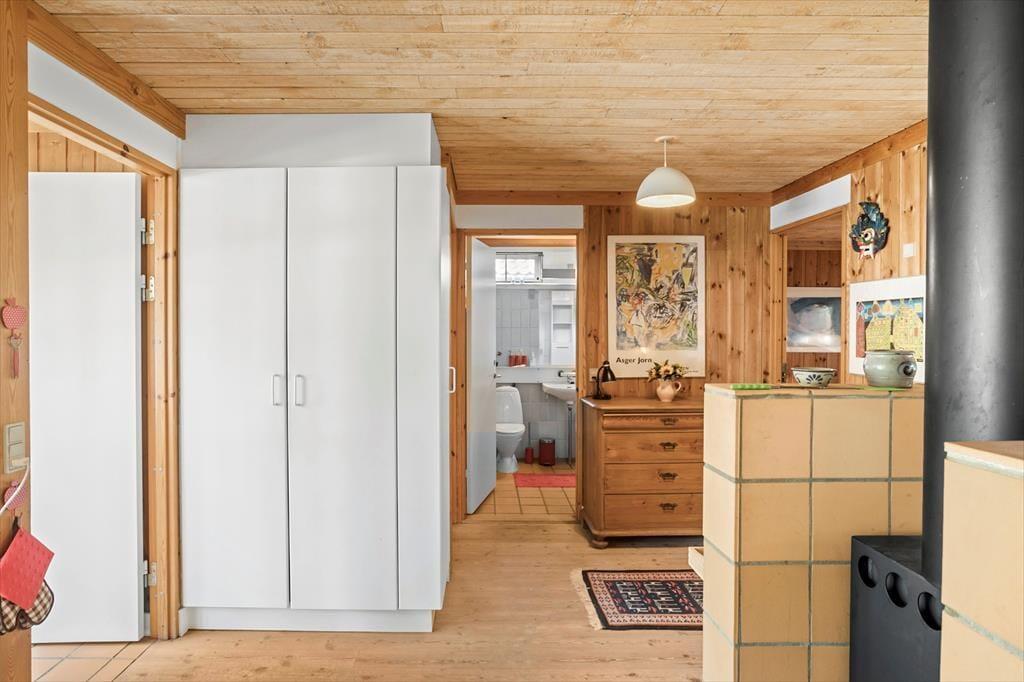 Fritidshuset indeholder: Entré, 2 gode soveværelser – det ene med dobbeltseng og det andet værelse med 2 køjesenge, 1 badeværelse med bruser og wc, køkken-alrum med spiseafdeling, stue med sofaområde, samt udgang fra stuen til en skøn delvist overdækket terrasse.