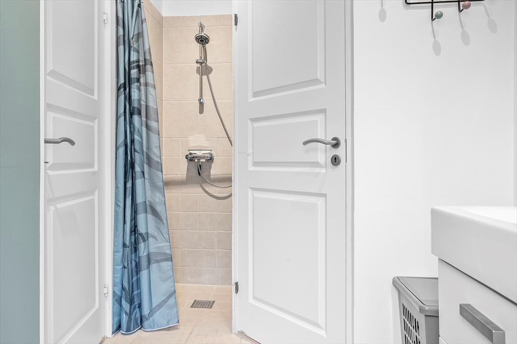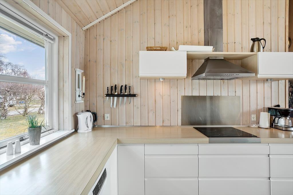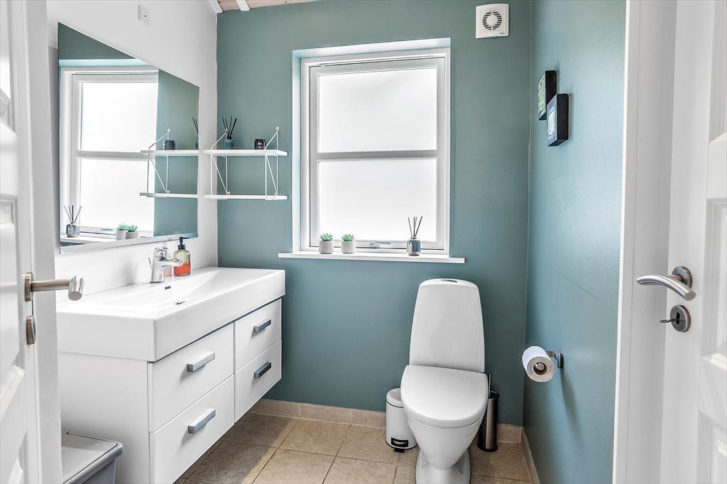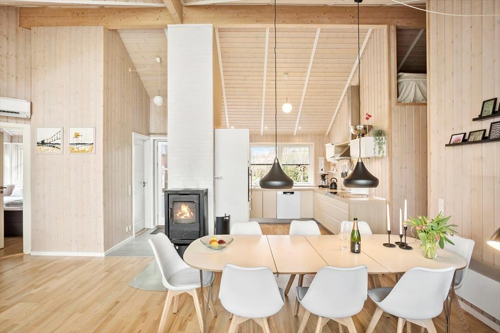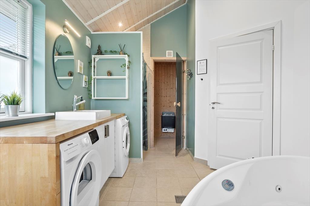 Fritidshuset indeholder: Entre, gæstetoilet, 4 rigtig gode soveværelser, badeværelse med wc, bruser, spa og sauna, køkken-alrum med spiseafdelingen tæt på, stue med sofaområde og udgang til terrassen.