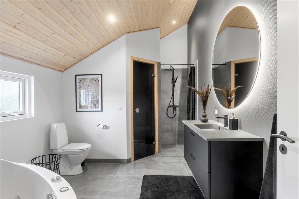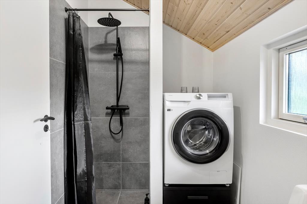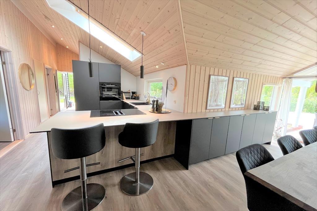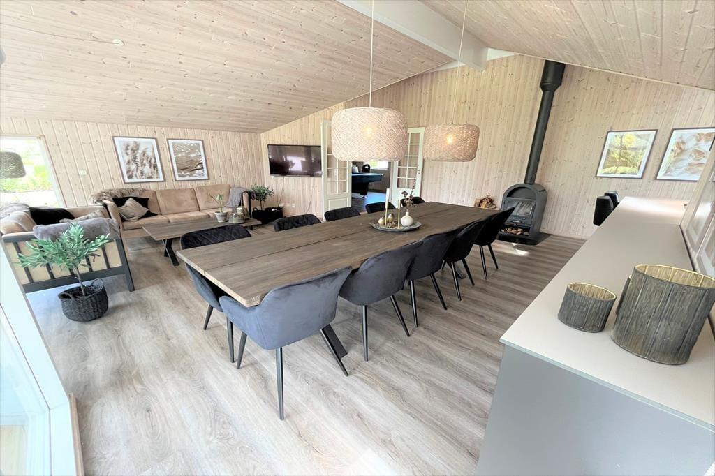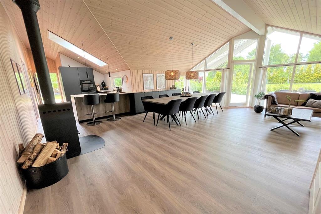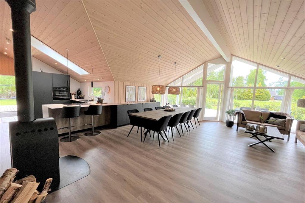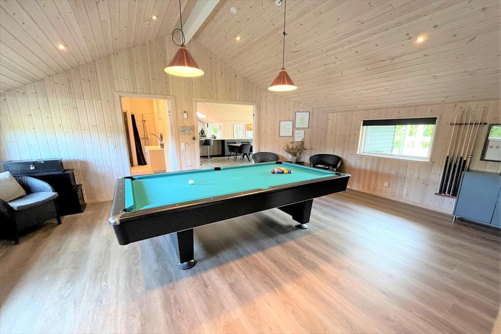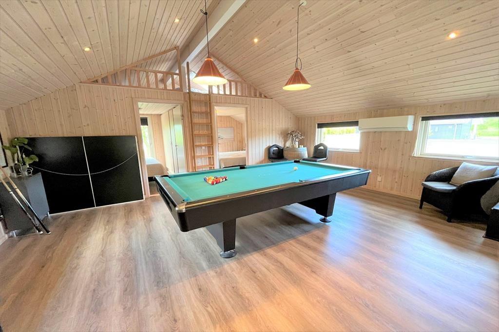 Fritidshuset er indrettet med 4 gode og flotte soveværelser, alle soveværelserne er alle dobbeltværelser med dobbeltsenge, samt en stor hems, hvor der kan sove 2 personer. Derudover er huset indrettet med adgang til en lille god entré hvor husets ene badeværelse også findes, som indeholder WC, bruser, vaskemaskine og en tørretumbler. Desuden byder fritidshuset på det store åbne køkken-alrum, hvor du i den ene ende har det flotte og moderne køkken, i åben forbindelse med stuen som har sofaafdeling og spiseområde. Samt fra stuen er der udgang til den store og dejlige terrasse, samt haven. Fra stuen er der også indgang til husets aktivitetsrum, som indeholder både billardbord og bordtennis, ved aktivitetsrummet af finder vi badeværelse nummer 2 med WC, bruser, Spabad og en lækker sauna.