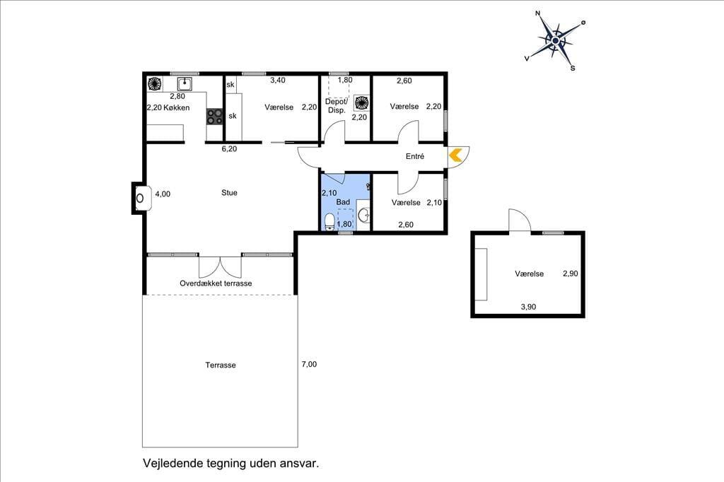 Fritidshuset indeholder: Entre , 3 gode lyse soveværelser, pænt badeværelse med håndvask, toilet, bruseniche. Pænt åbent køkken med god skabsplads. Stue opdelt med spiseområde og sofaafdeling, endvidere har fritidshuset brændeovn, varmepumpe, samt udgang fra stuen til den dejlige store træterrasse og haven.