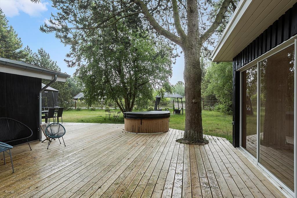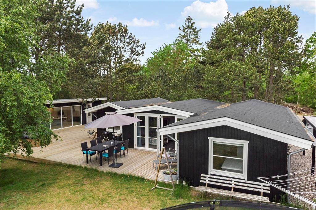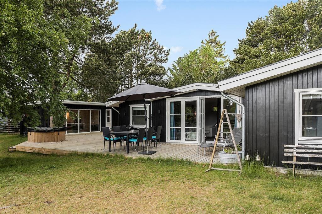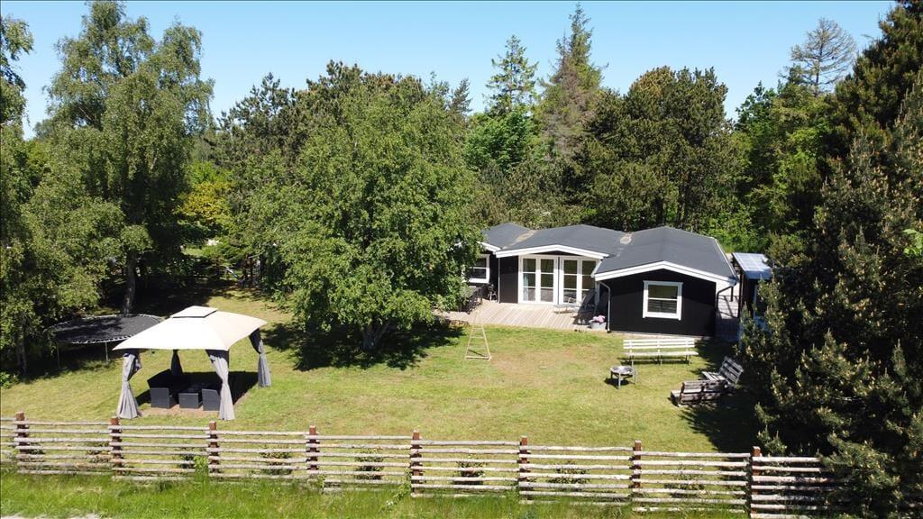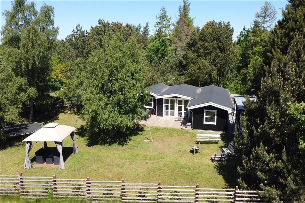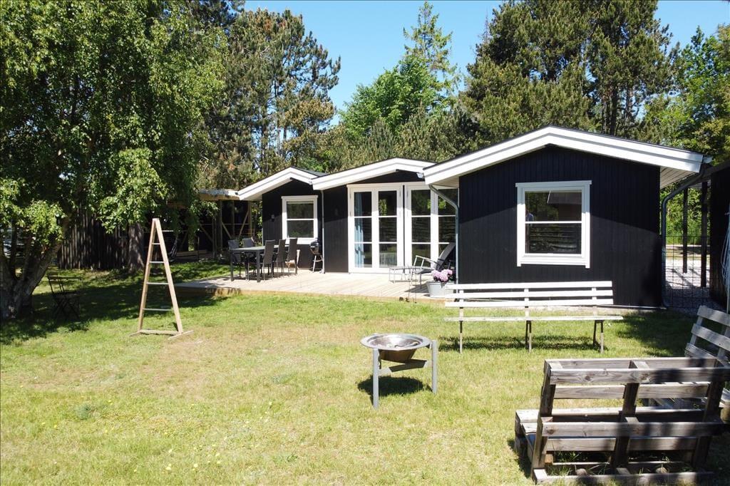 Feriehuset er beliggende på en 1143 m2 stor grund med træer og buske rundt om grunden, samt en stor græsplæne til leg og spil. Endvidere har feriehuset en skøn terrasse som indbyder til hyggelige stunder med familien eller venner.